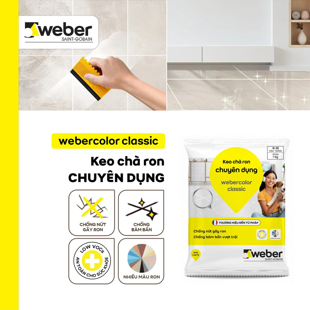 Dòng keo chà ron dành cho các khu vực thông dụng Webercolor Classic sẽ là giải pháp tối ưu thời gian và chi phí thi công mà vẫn đảm bảo những tính năng vượt trội như: