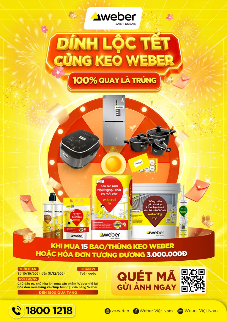 Khi mua 15 bao keo dán gạch Weber, hoặc hóa đơn tương đương 3.000.000Đ