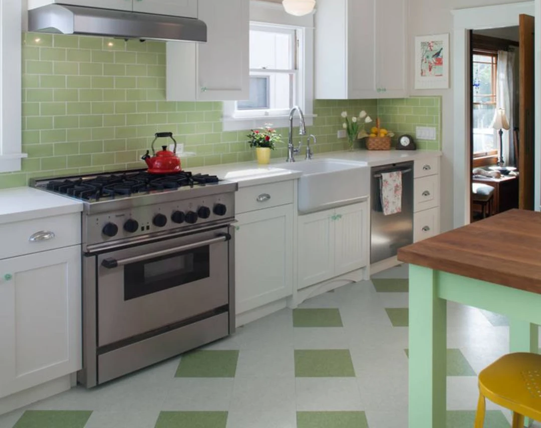 Không thể phủ nhận rằng gạch lát nền màu xanh lá cây mang lại cảm giác hết sức vui vẻ, tràn đầy năng lượng. Tuy nhiên, màu xanh lá lại không có sự sang trọng, tinh tế cần thiết để dùng cho khu vực phòng khách. Thay vào đó, bạn có thể sử dụng để lát phòng ngủ hoặc phòng bếp giúp tâm trạng luôn hứng khởi, vui vẻ.