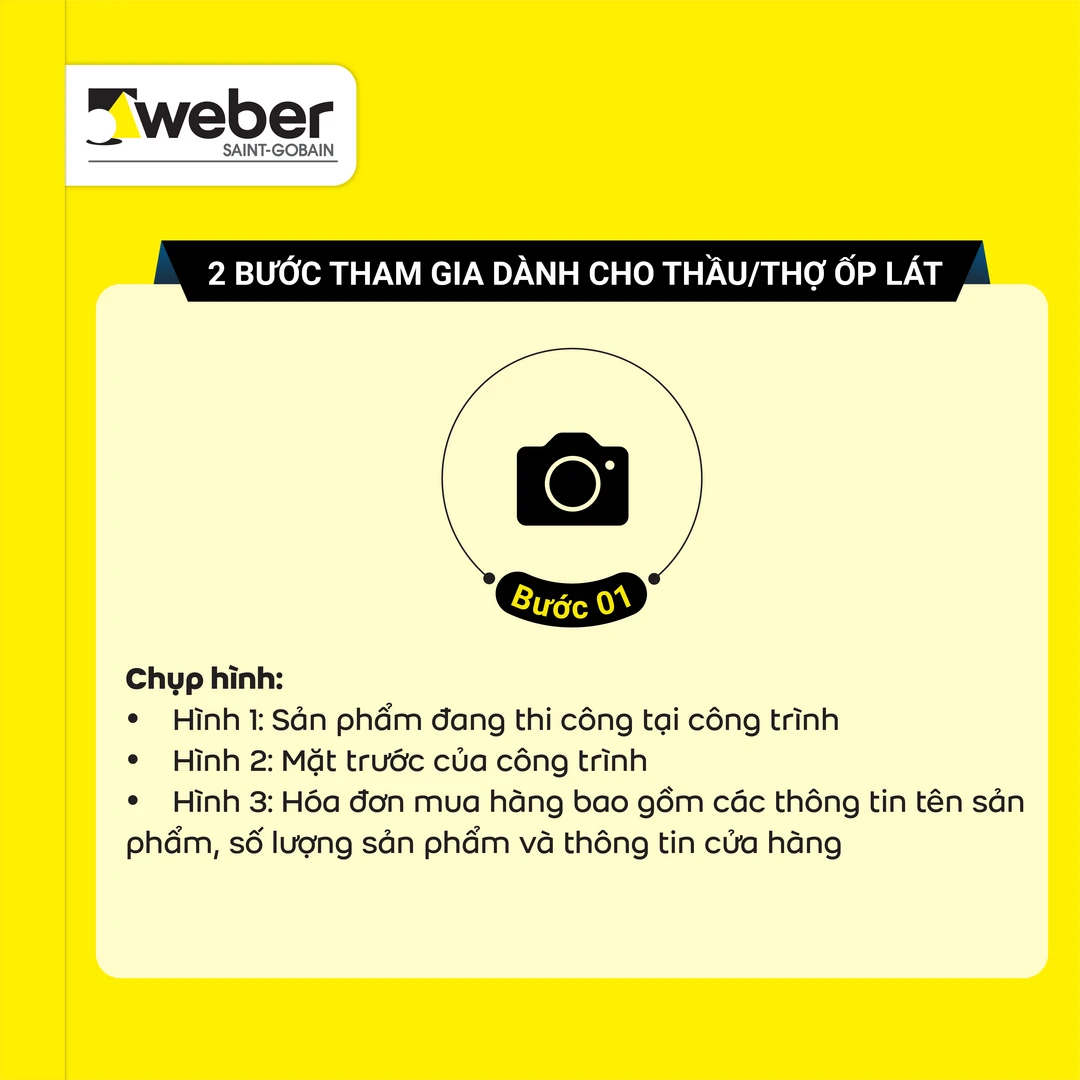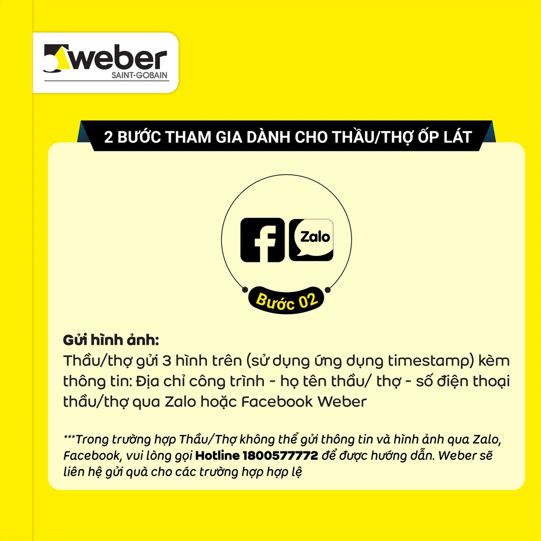 Thầu/thợ gửi 3 hình trên (sử dụng ứng dụng Timestamp) kèm thông tin: Địa chỉ công trình - họ tên thầu/ thợ - số điện thoại thầu/thợ qua Zalo hoặc Facebook Weber