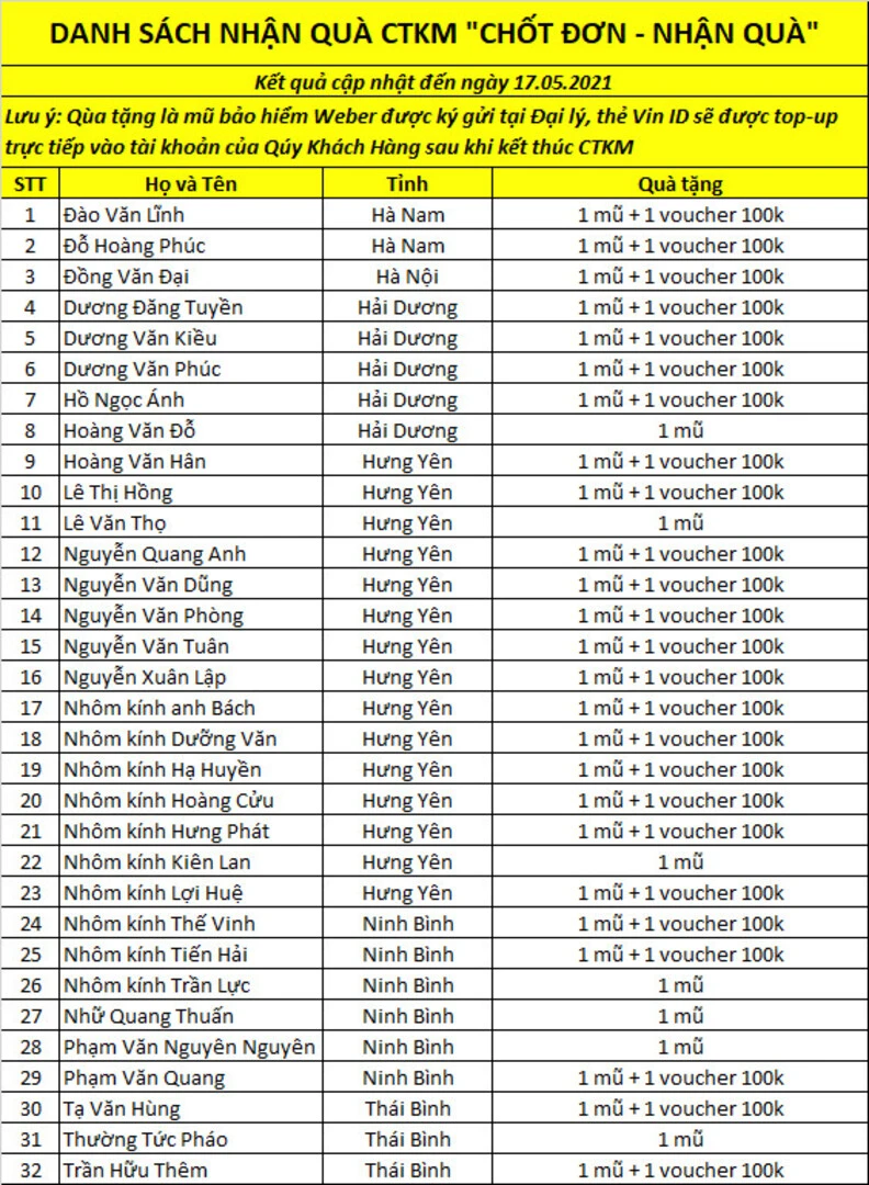 WEBER cập nhật danh sách thầu thợ nhận được quà tặng thông qua chương trình CHỐT ĐƠN NHẬN QUÀ đợt 1. Mời anh em thầu thợ cùng theo dõi.