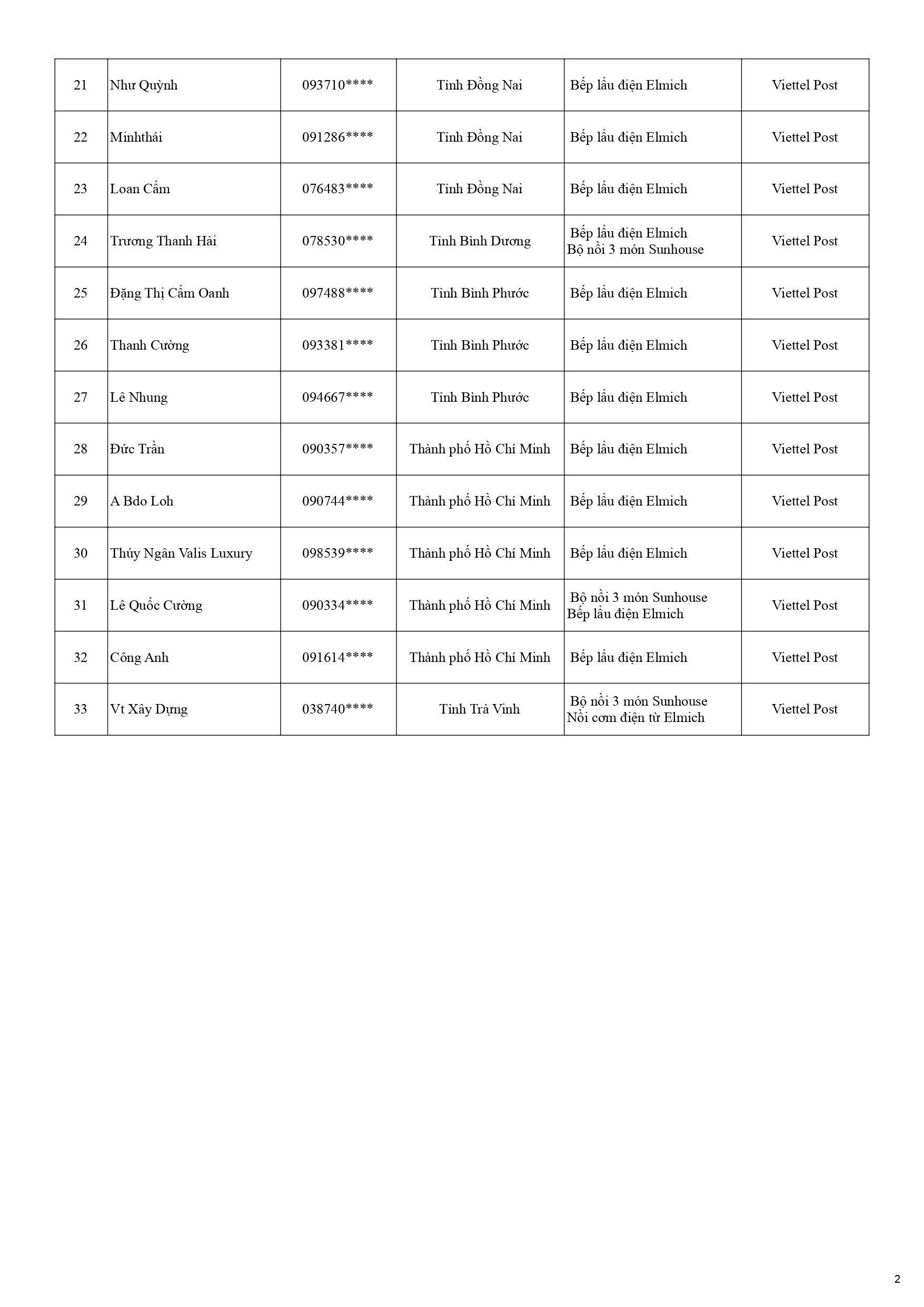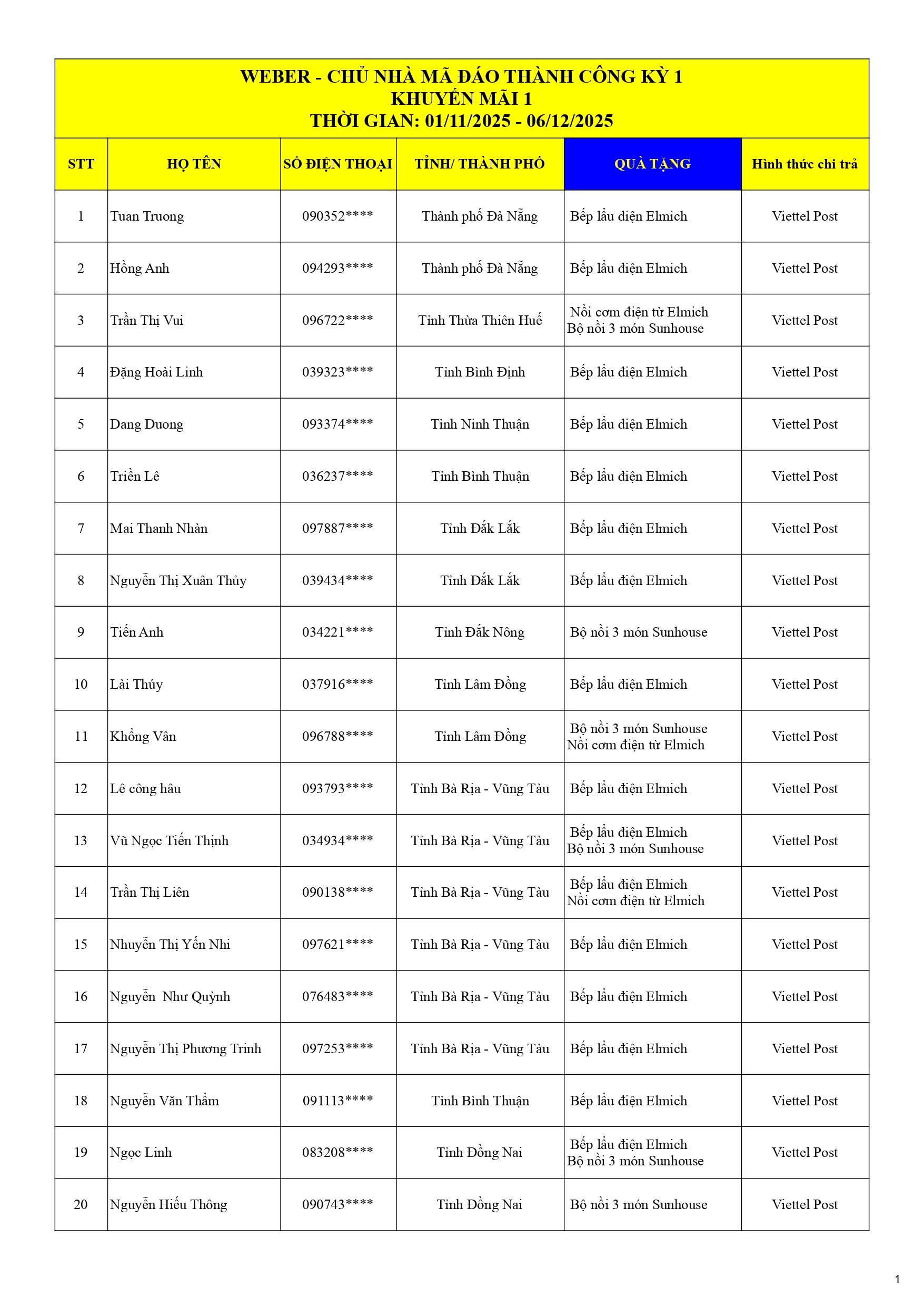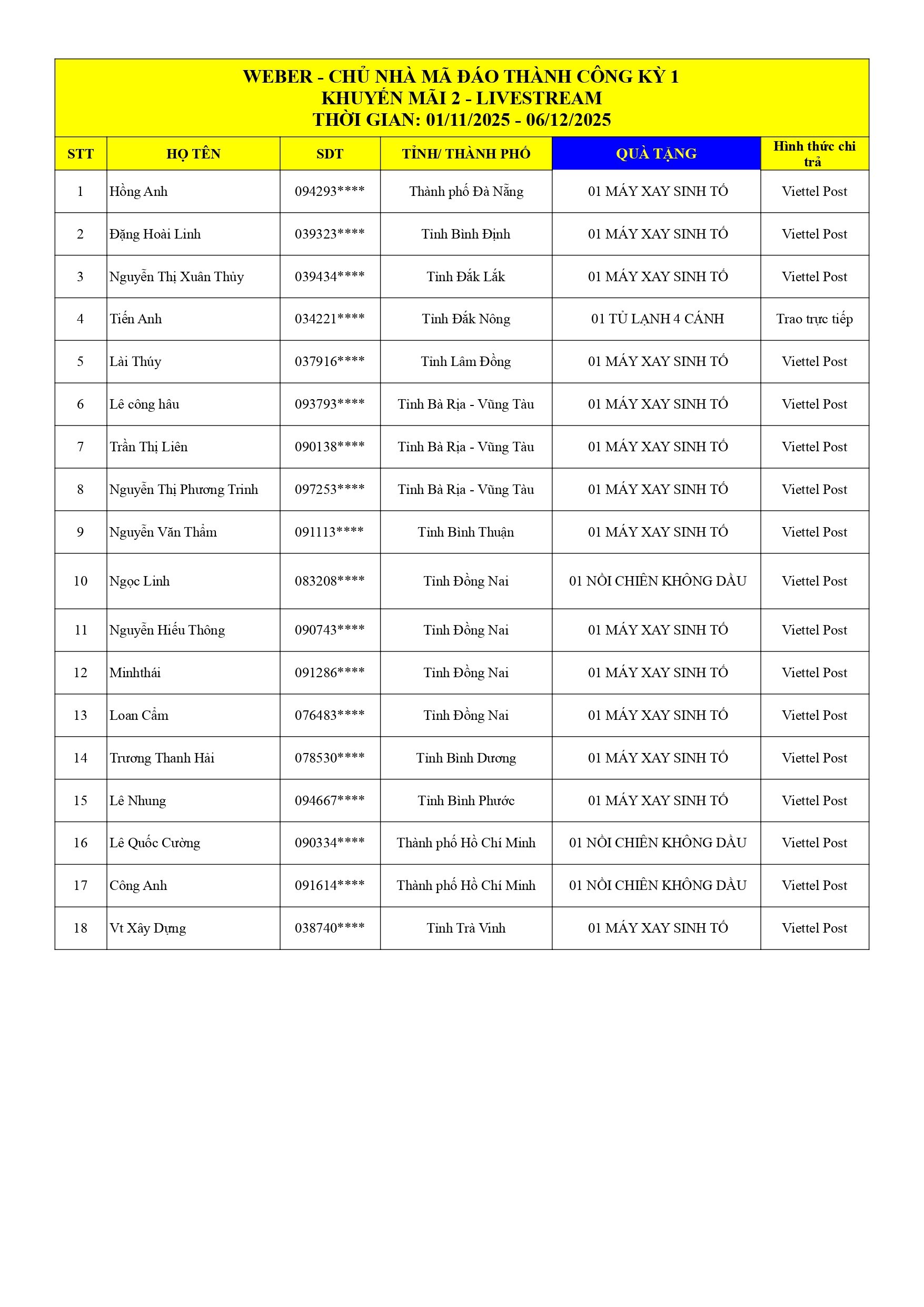DANH SÁCH KẾT QUẢ CTKM "CHỦ NHÀ WEBER MÃ ĐÁO THÀNH CÔNG KỲ 1"