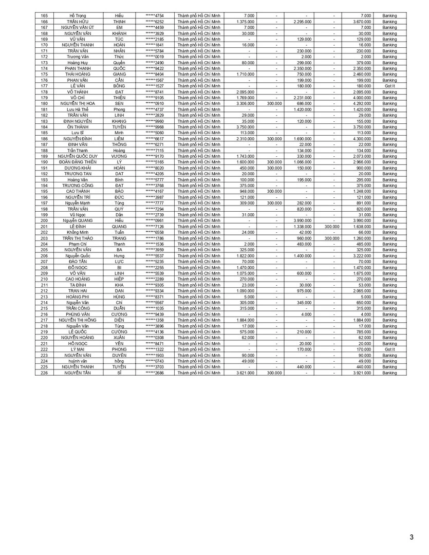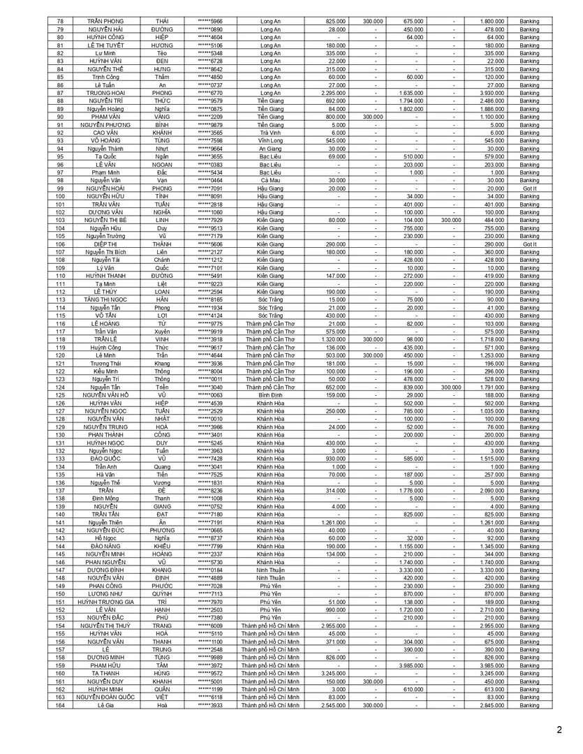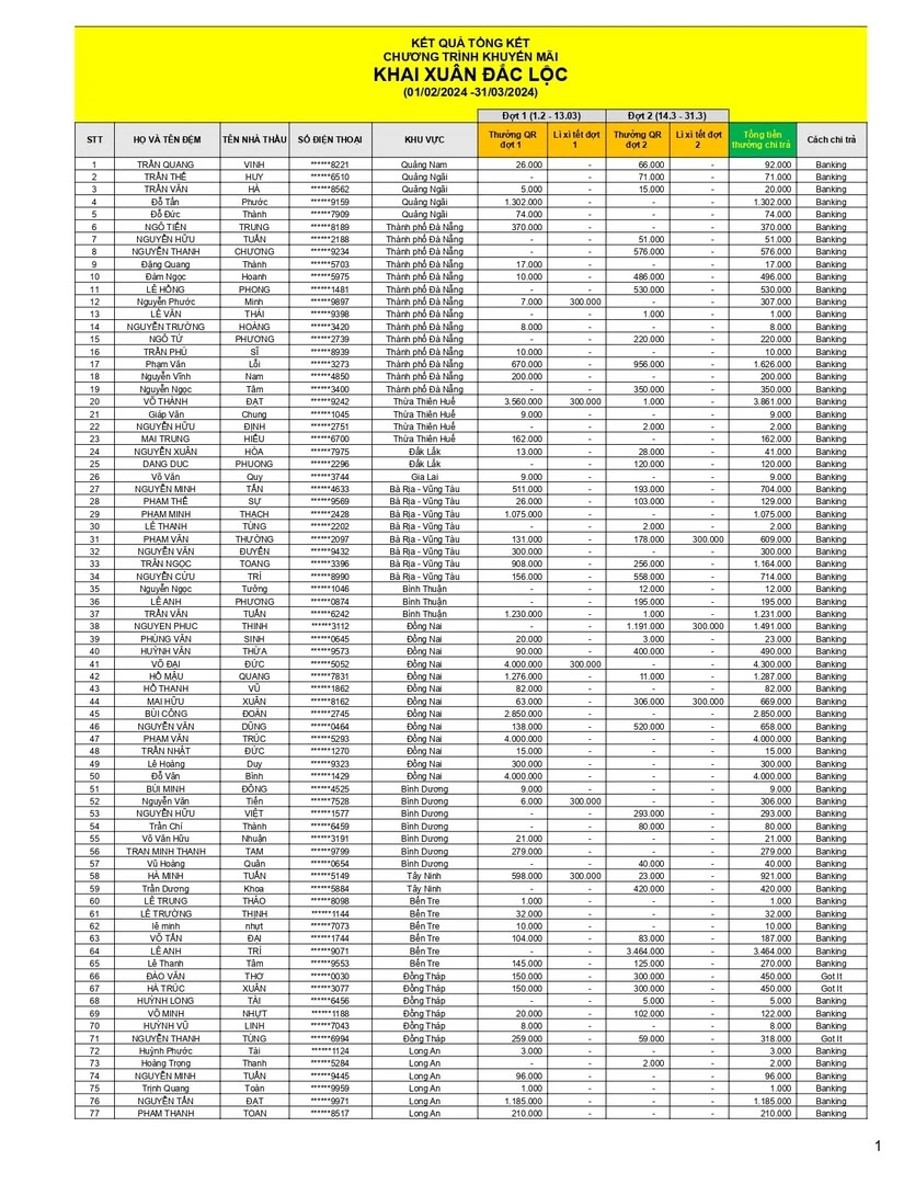 DANH SÁCH CHI TRẢ KẾT QUẢ CHƯƠNG TRÌNH KHUYẾN MÃI "KHAI XUÂN ĐẮC LỘC"
