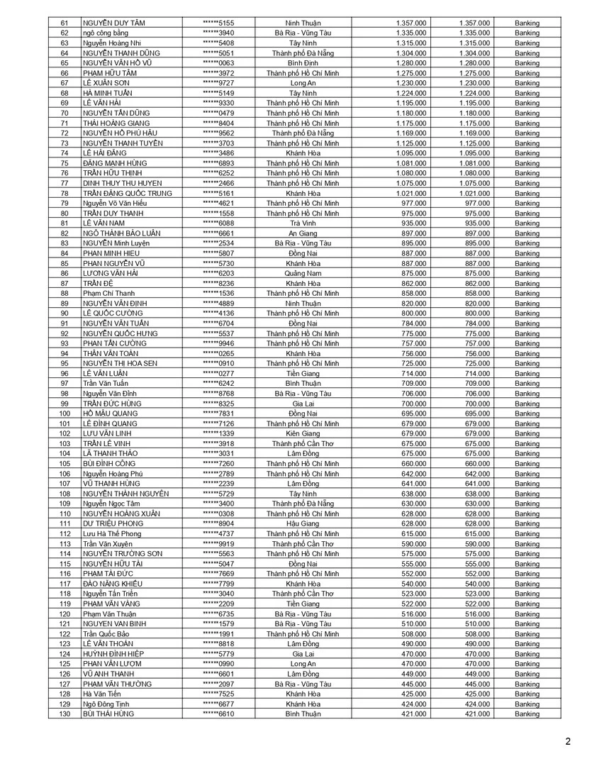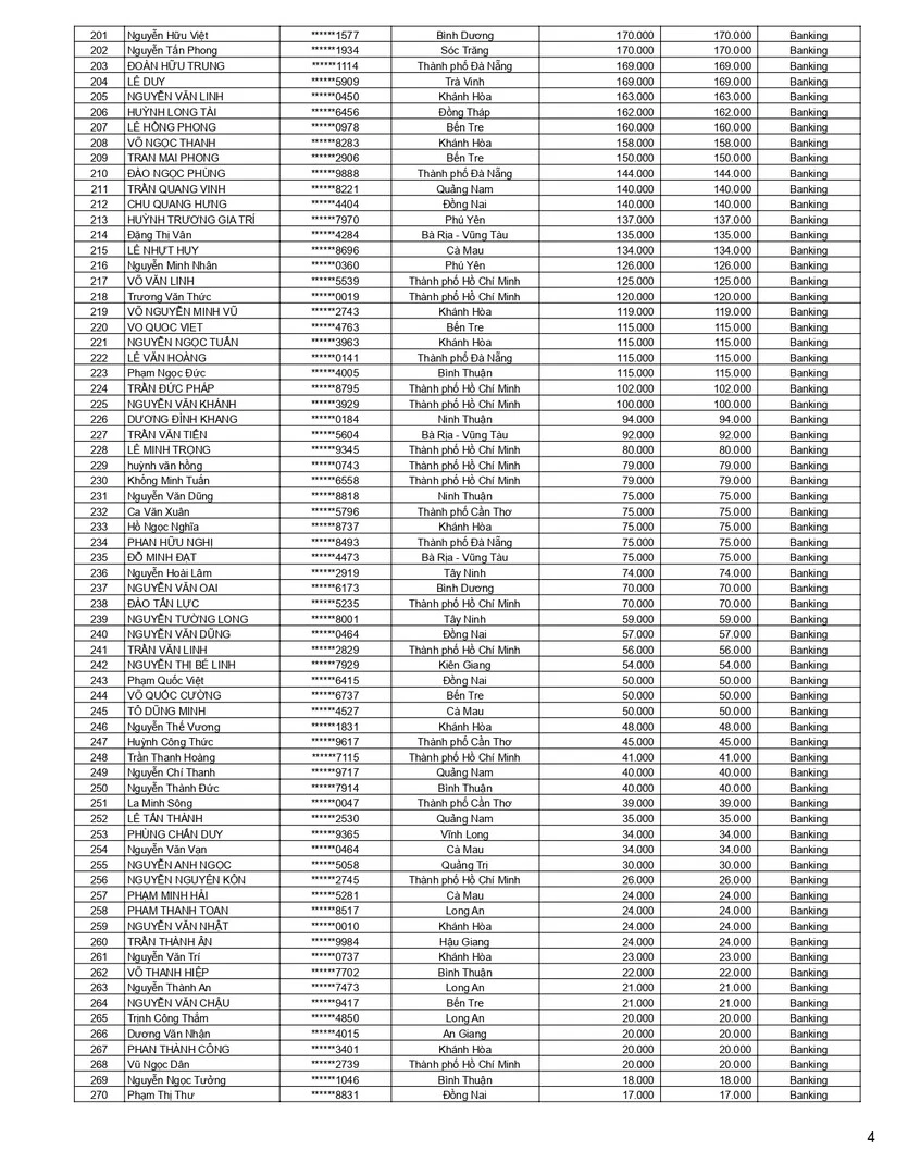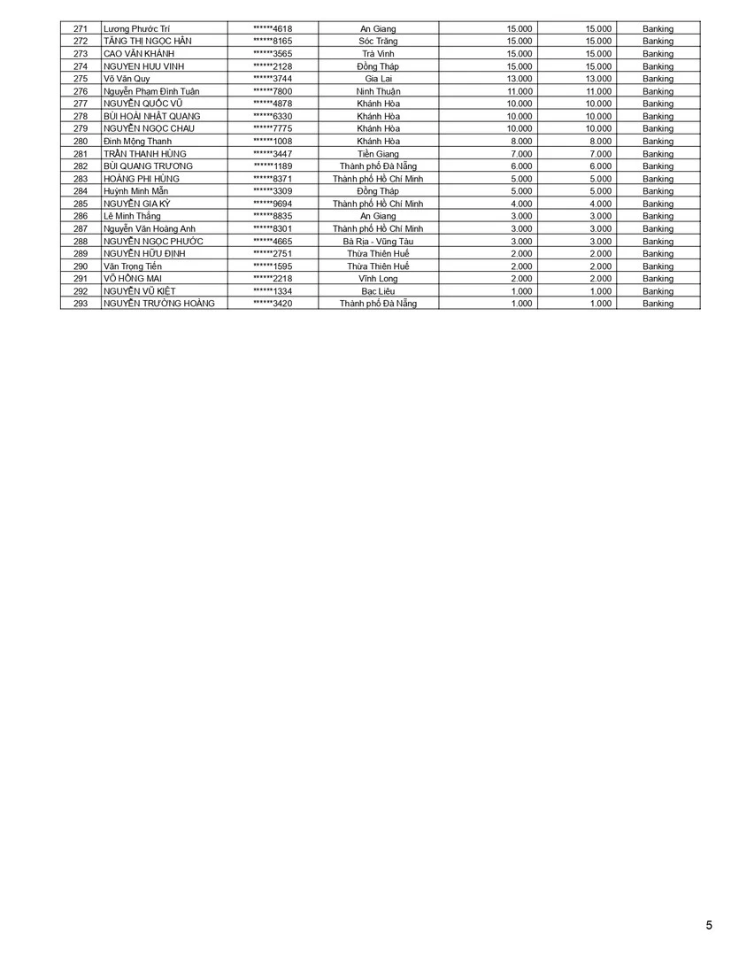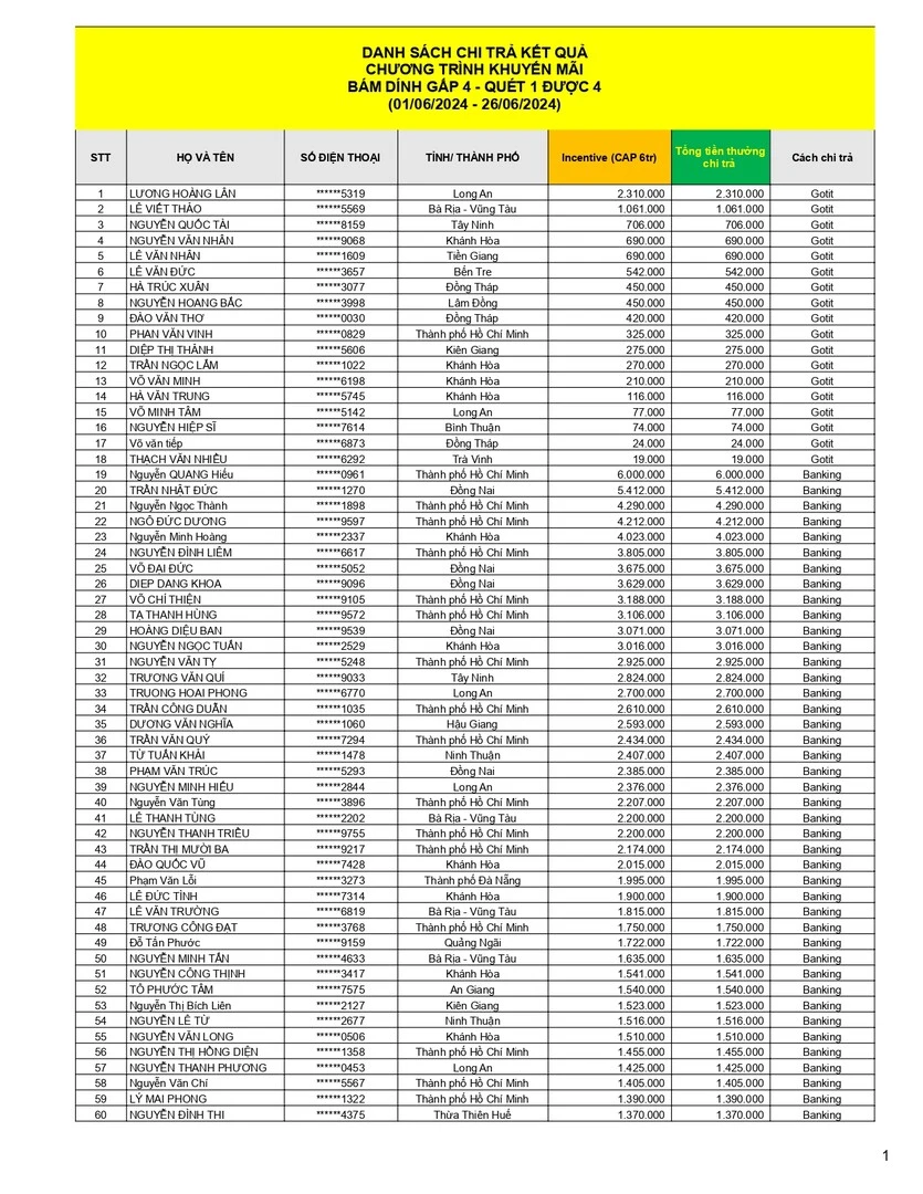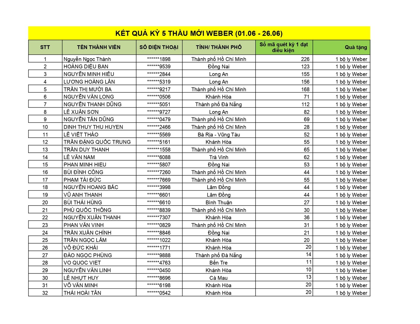 DANH SÁCH CHI TRẢ KẾT QUẢ CHƯƠNG TRÌNH KHUYẾN MÃI "BÁM DÍNH GẤP 4 - WEBER QUÉT 1 ĐƯỢC 4"