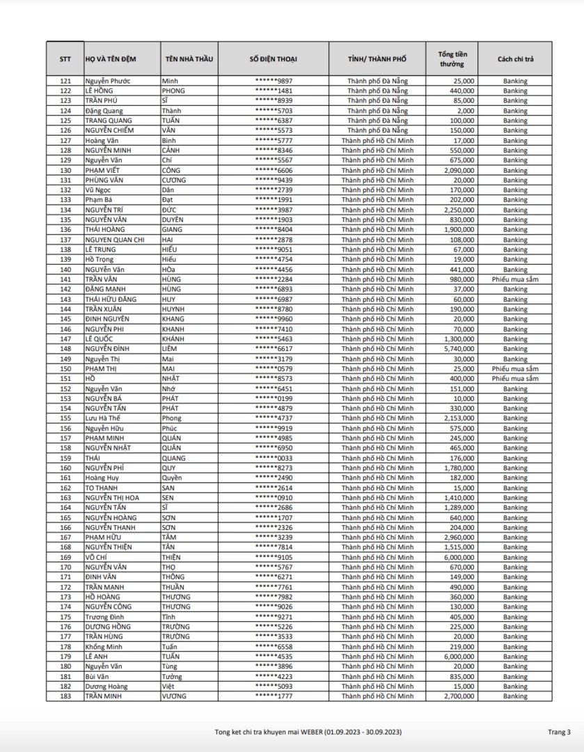 DANH SÁCH CHI TRẢ KẾT QUẢ CHƯƠNG TRÌNH KHUYẾN MÃI WEBER "KEO VÀNG THƯỞNG XỊN"