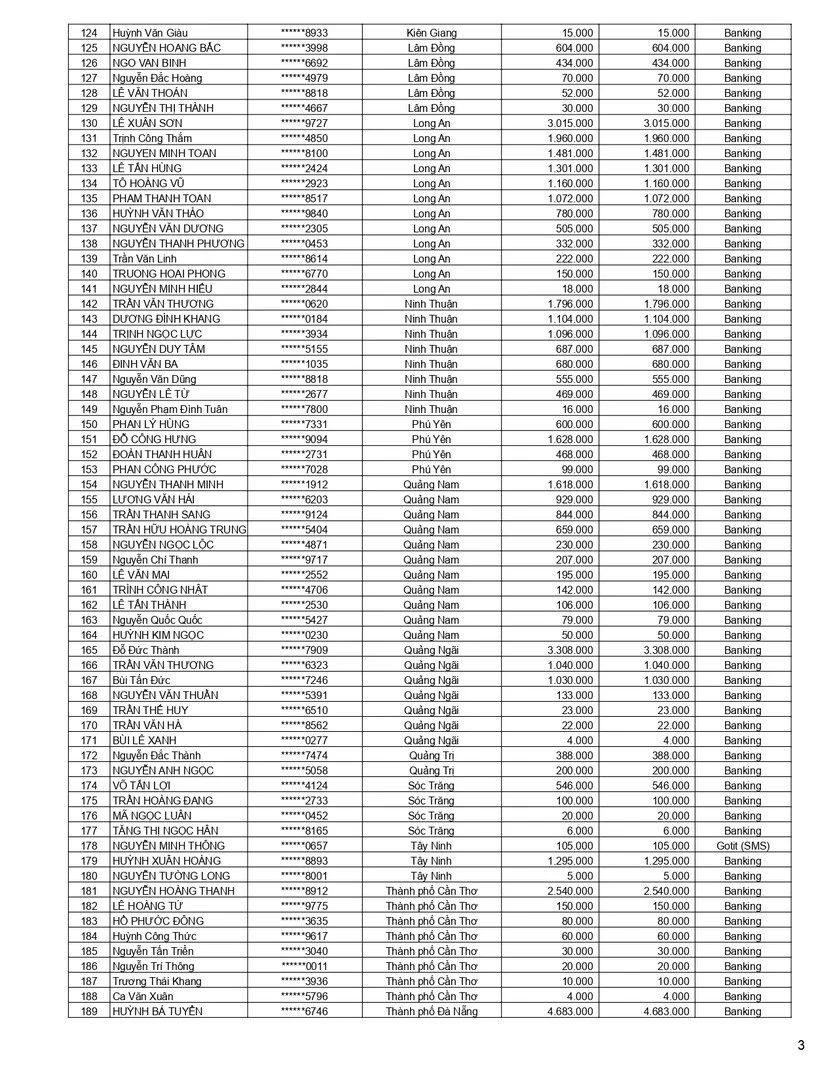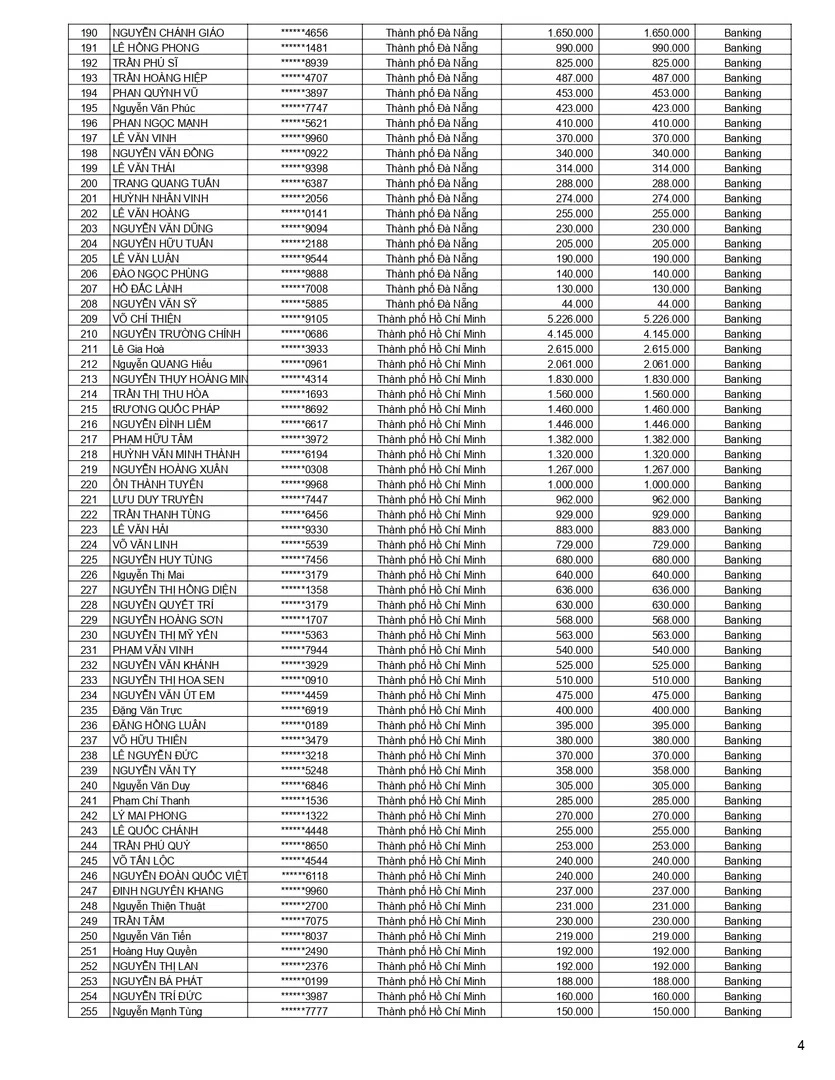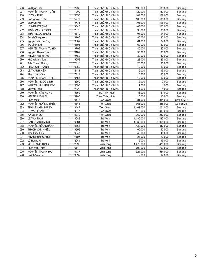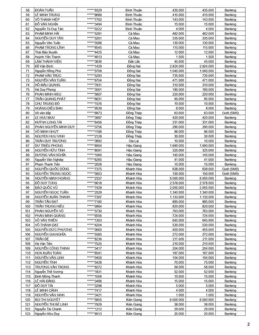 DANH SÁCH CHI TRẢ KẾT QUẢ CHƯƠNG TRÌNH KHUYẾN MÃI "THU VƯỢT TỐC"