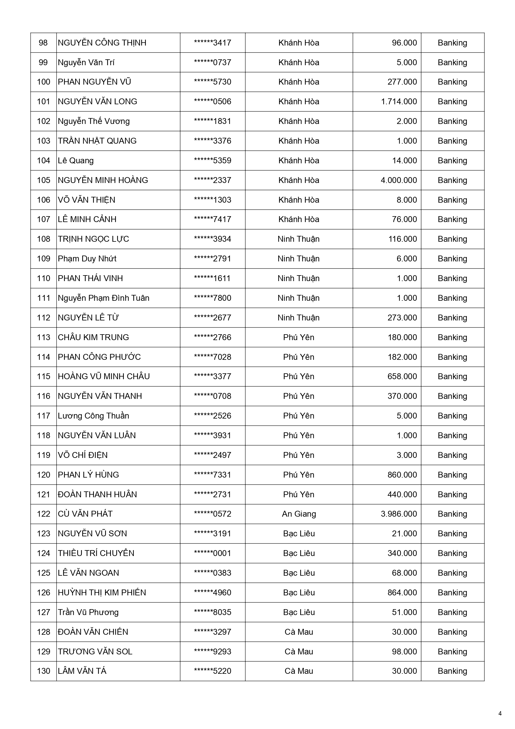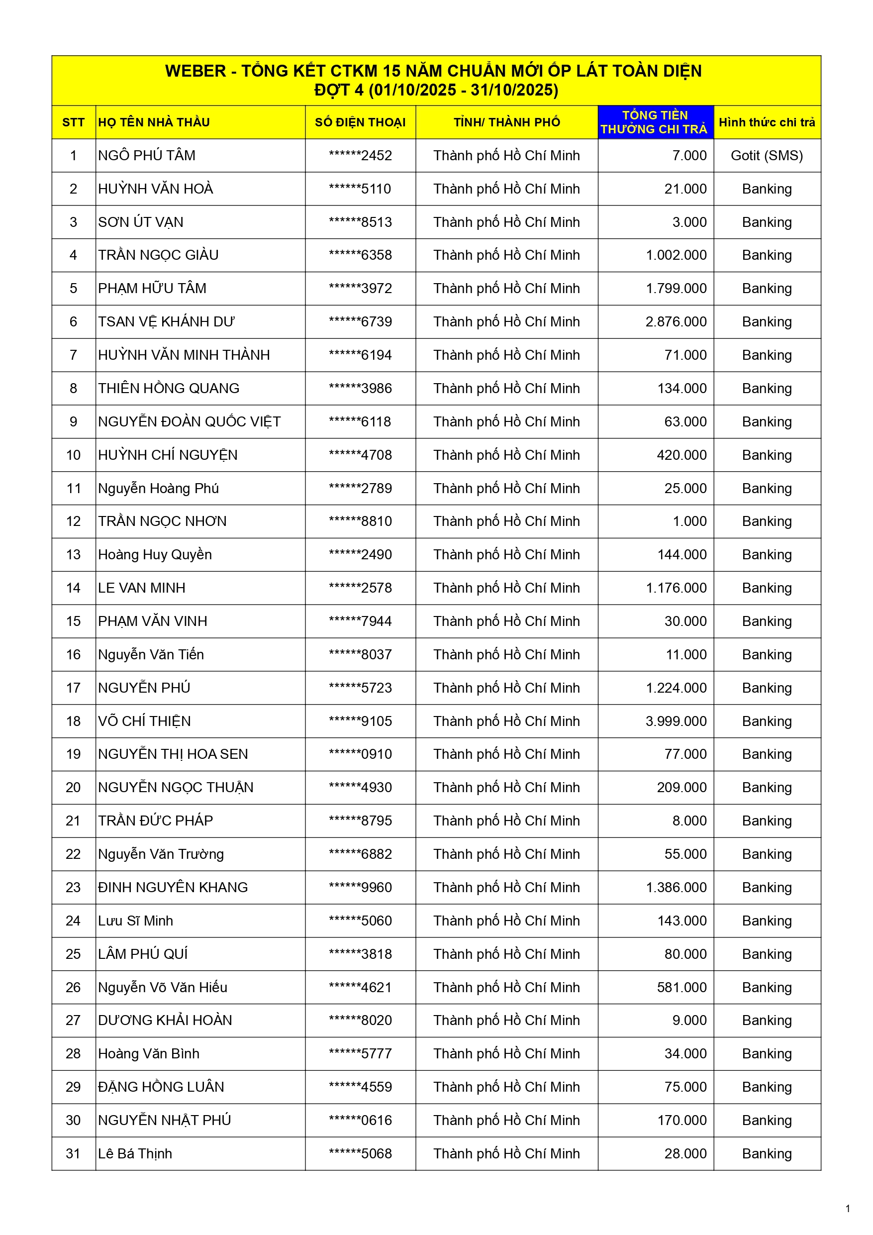 DANH SÁCH KẾT QUẢ CTKM "MỪNG WEBER 15 NĂM CHUẨN MỚI ỐP LÁT TOÀN DIỆN" ĐỢT 4