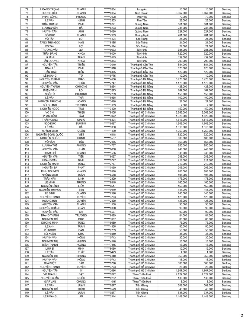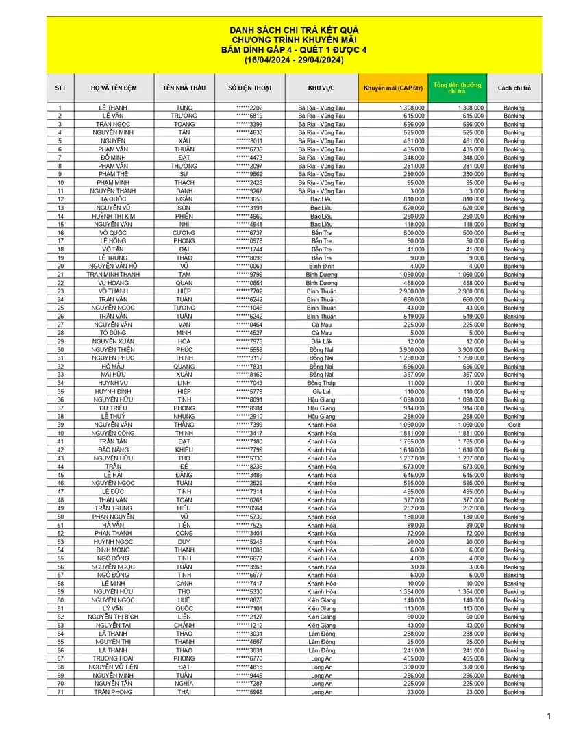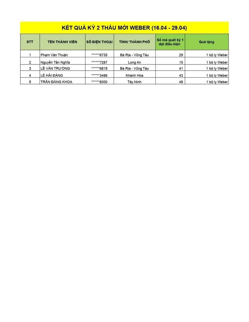 DANH SÁCH CHI TRẢ KẾT QUẢ CHƯƠNG TRÌNH KHUYẾN MÃI "BÁM DÍNH GẤP 4 - WEBER QUÉT 1 ĐƯỢC 4"