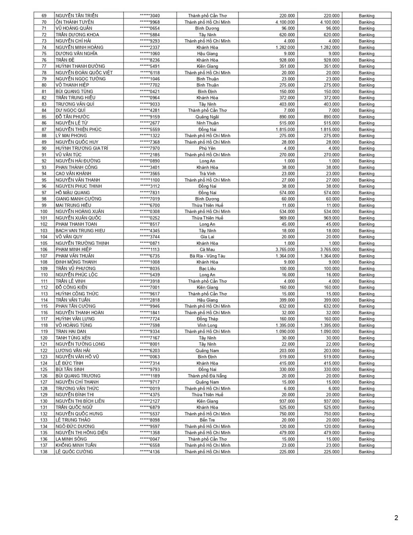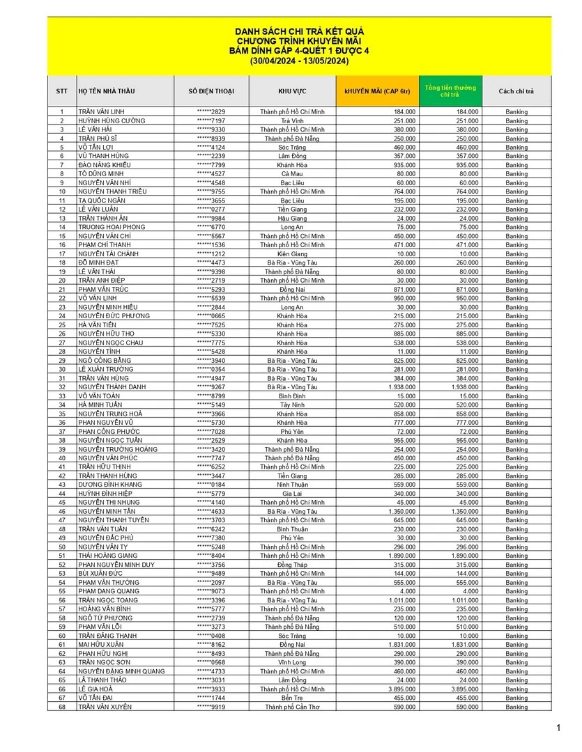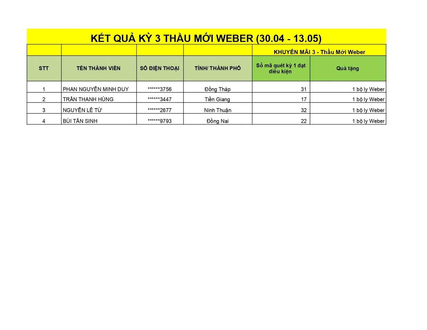 DANH SÁCH CHI TRẢ KẾT QUẢ CHƯƠNG TRÌNH KHUYẾN MÃI "BÁM DÍNH GẤP 4 - WEBER QUÉT 1 ĐƯỢC 4"