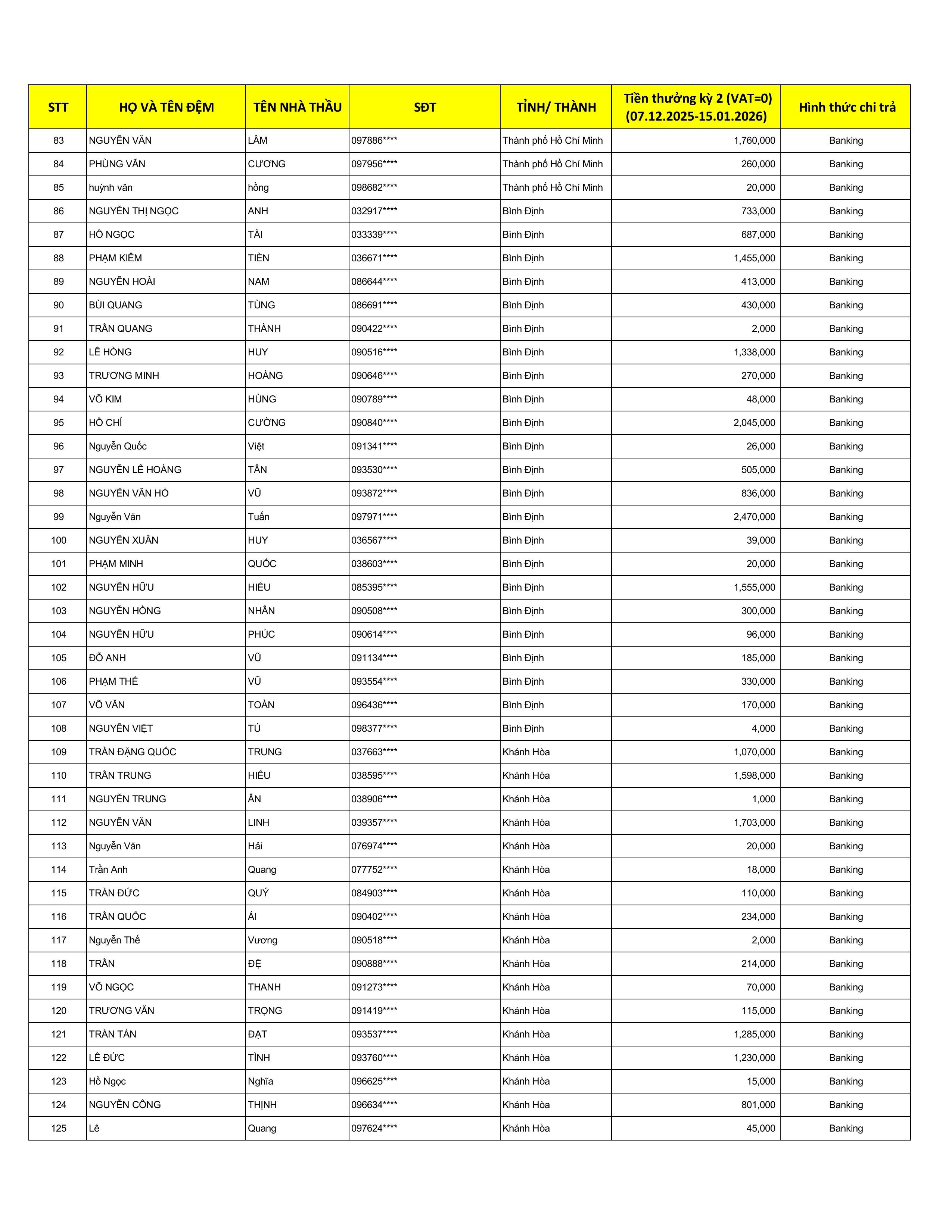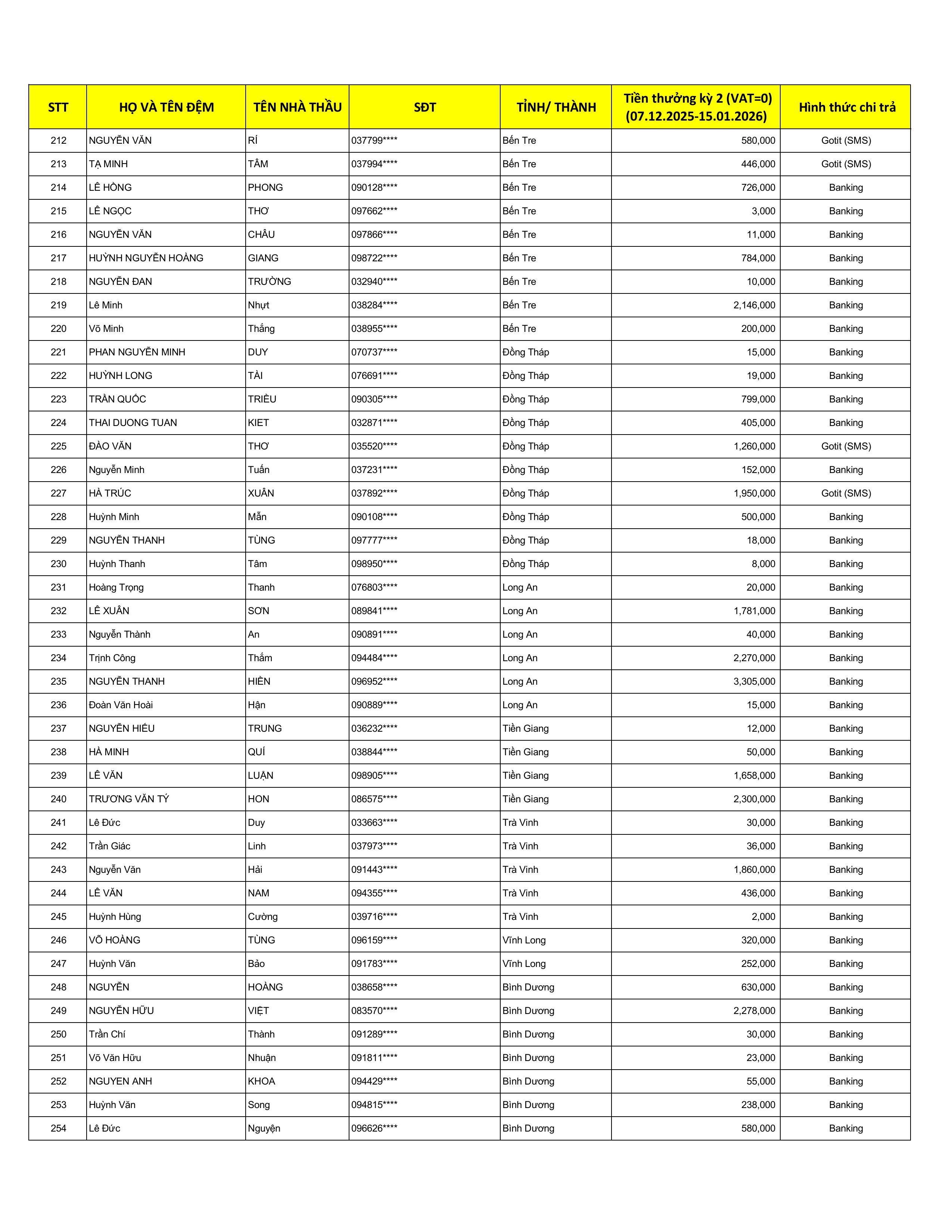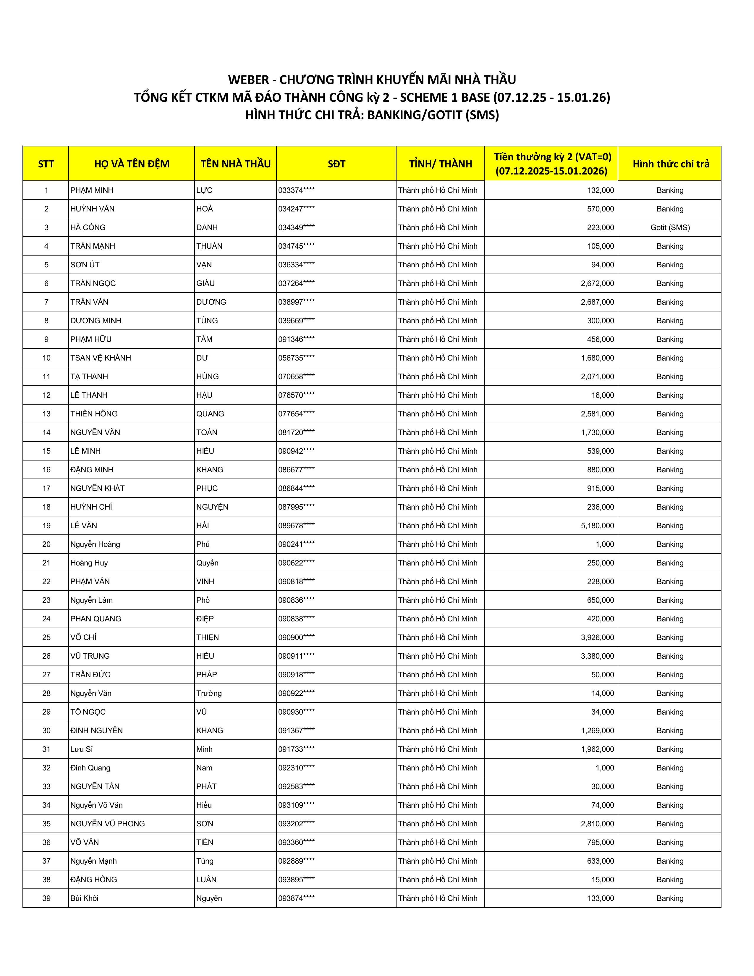 Miền Nam | KẾT QUẢ CTKM NHÀ THẦU WEBER MÃ ĐÁO THÀNH CÔNG - ĐỢT 2 (07/12/2025 - 15/01/2026)