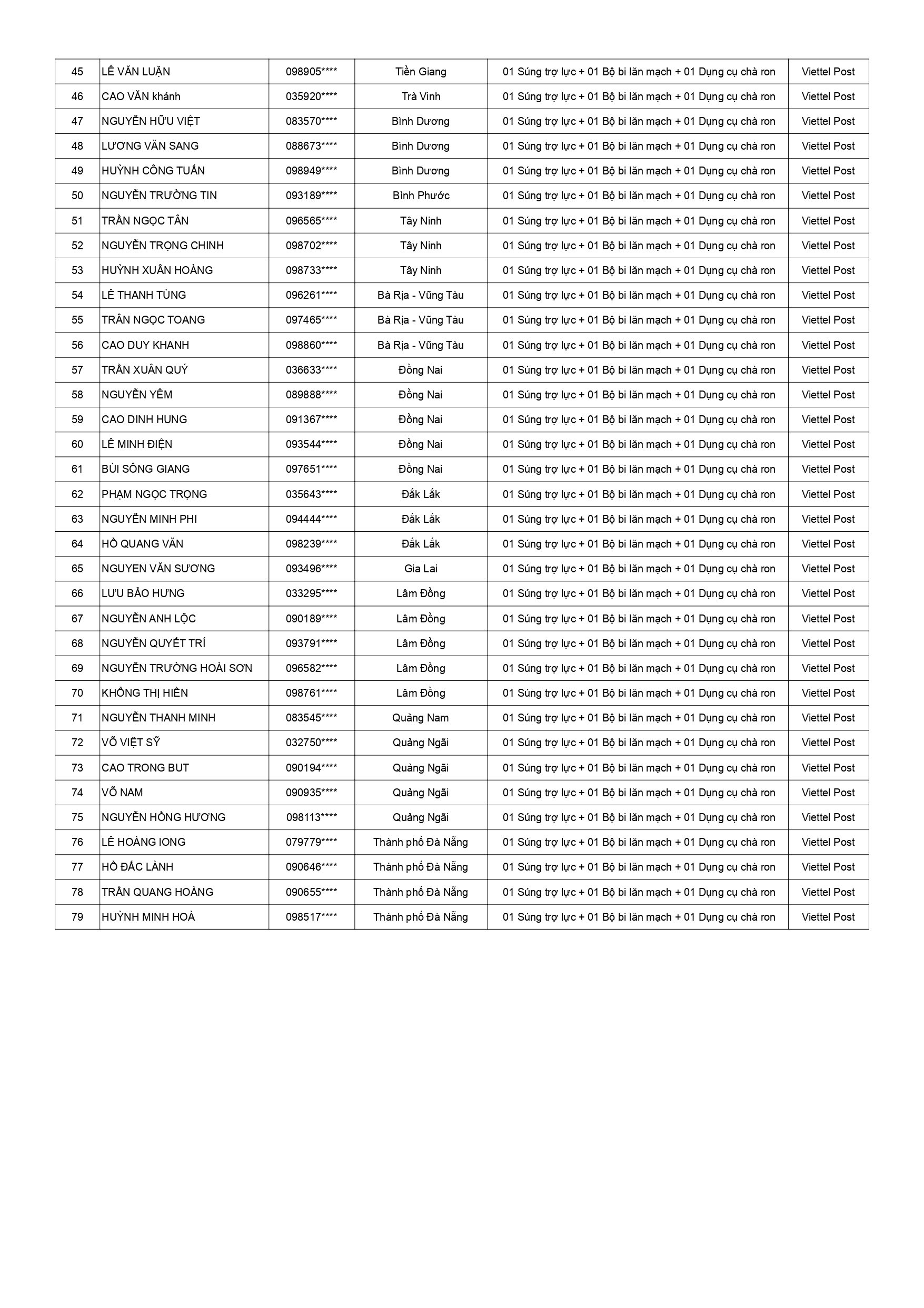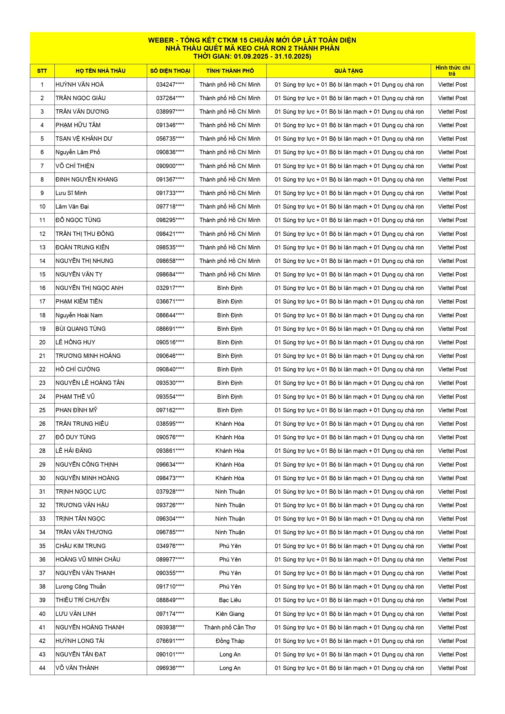 DANH SÁCH KẾT QUẢ CTKM "NHÀ THẦU QUÉT MÃ KEO CHÀ RON 2 THÀNH PHẦN VÀ NHÀ THẦU MỚI WEBER"