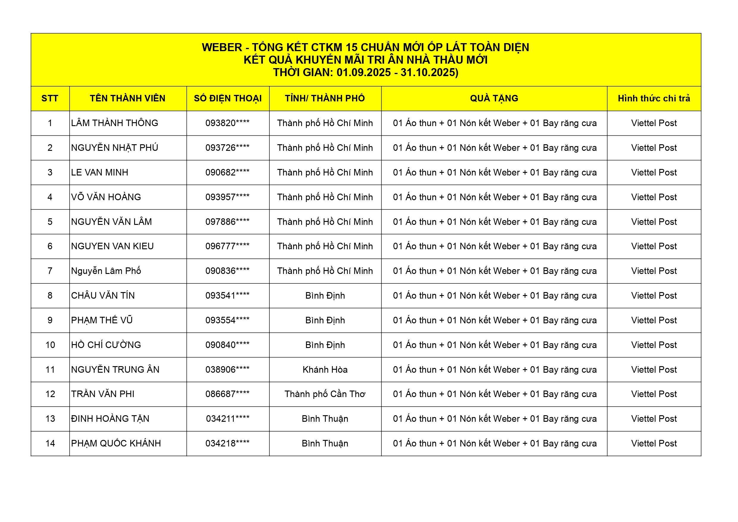 Miền Nam | Kết Quả CTKM NHÀ THẦU QUÉT MÃ KEO CHÀ RON 2 THÀNH PHẦN VÀ NHÀ THẦU MỚI WEBER (01/09/2025 - 31/10/2025)