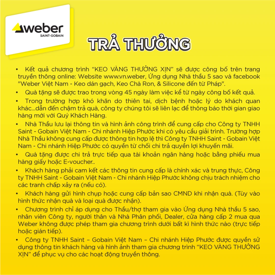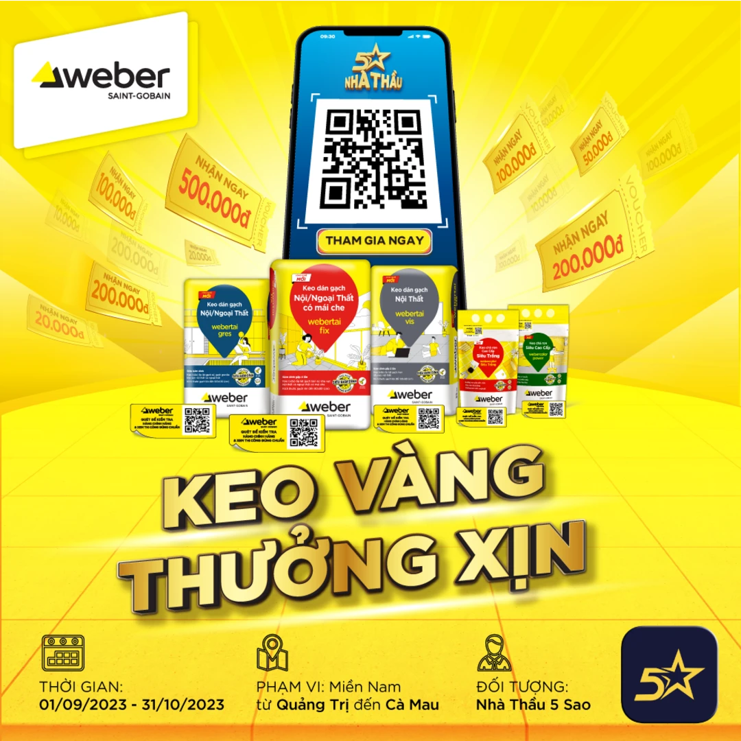 ⚡️ Để gia tăng quyền lợi cho quý khách hàng là nhà thầu ốp lát mua và thi công sản phẩm keo dán gạch & chà ron Weber. Tháng 9 & tháng 10 Weber tiếp tục triển khai chương trình khuyến mãi KEO VÀNG THƯỞNG XỊN⚡️