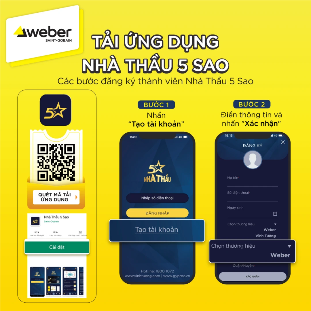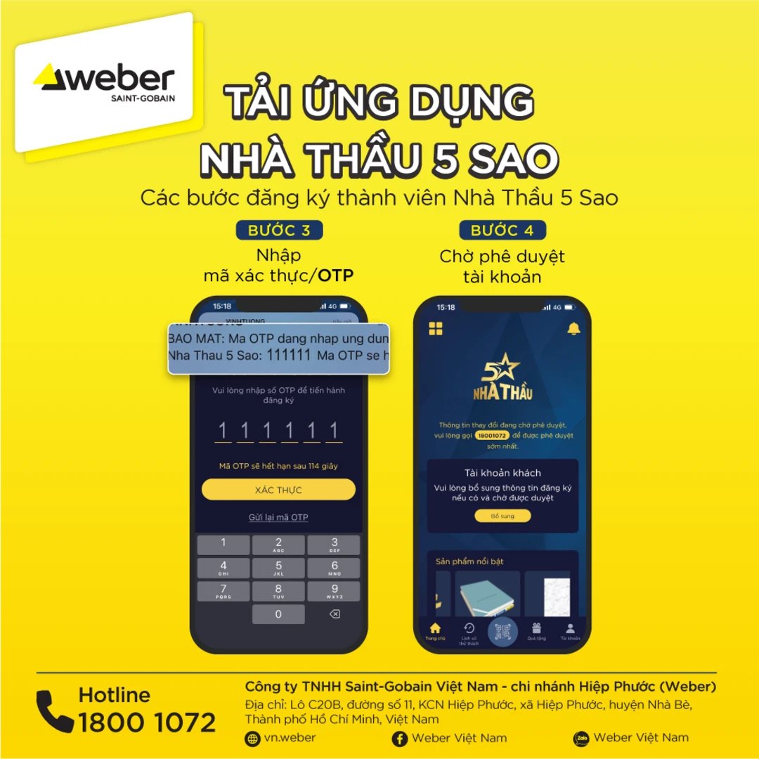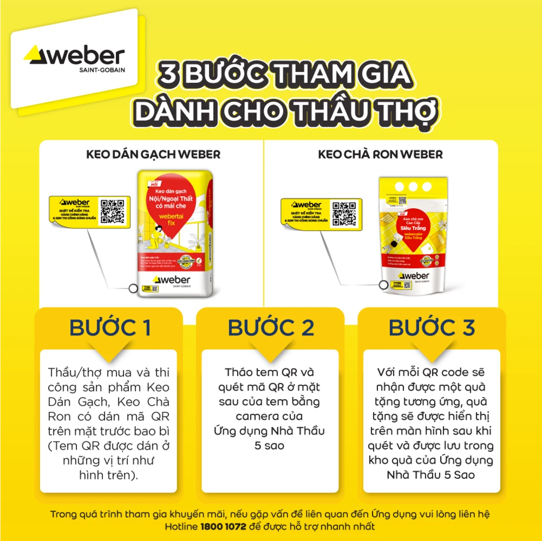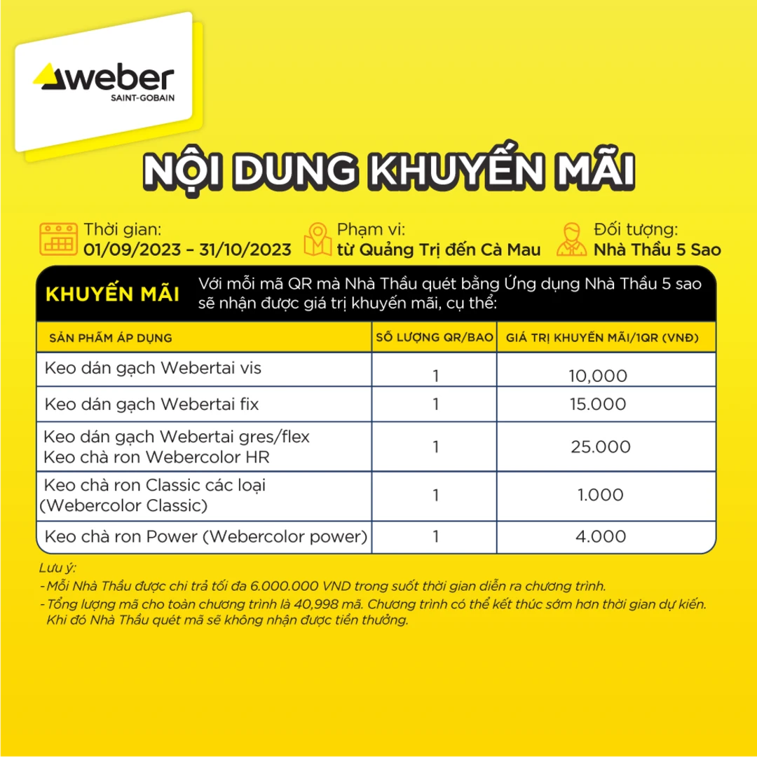 🙋♀️ Đối tượng tham gia: Nhà thầu mua, thi công sản phẩm keo dán gạch và chà ron Weber tham gia Câu Lạc Bộ Nhà thầu 5 Sao.