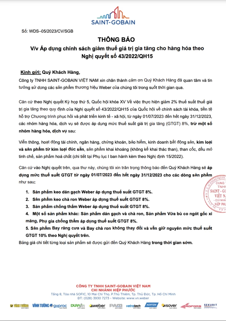 Căn cứ vào Nghị quyết trên, qua thư này, chúng tôi xin trân trọng thông báo đến Quý Khách Hàng sẽ áp dụng mức thuế suất GTGT từ ngày 01/07/2023 đến hết ngày 31/12/2023 cho các dòng sản phẩm như sau:
