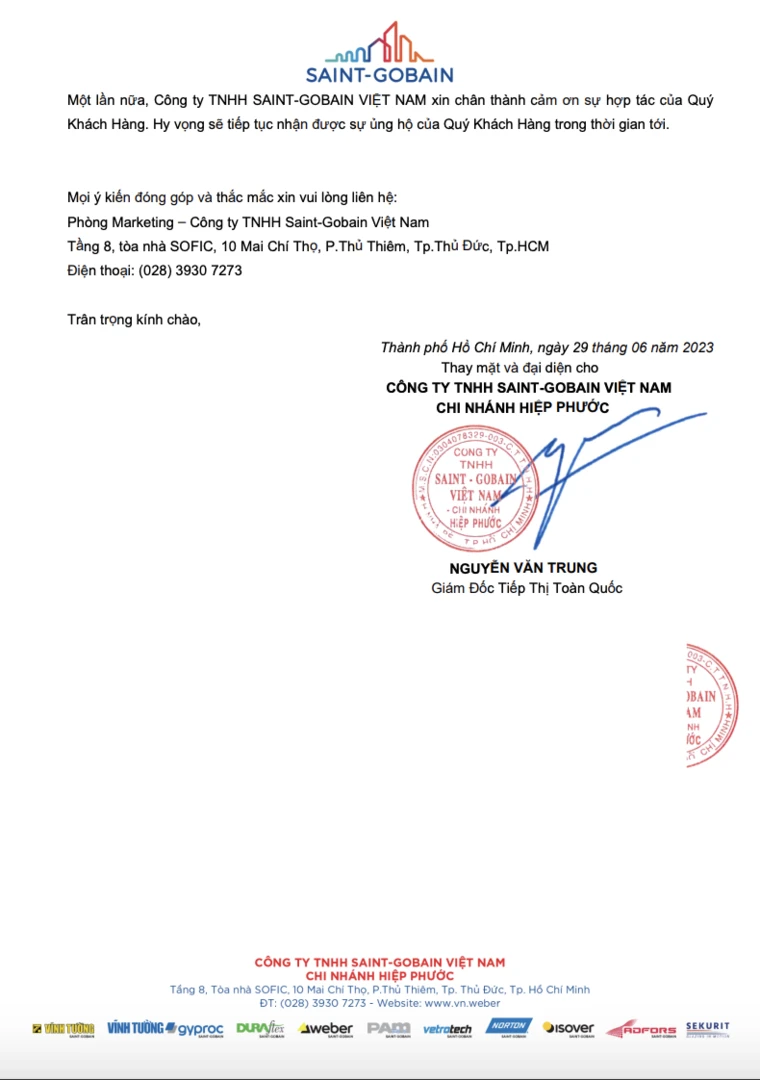 Một lần nữa, CÔNG TY TNHH SAINT-GOBAIN VIỆT NAM xin chân thành cảm ơn sự chia sẻ của Quý Khách Hàng. Hy vọng sẽ tiếp tục nhận được sự ủng hộ của Quý Khách Hàng trong thời gian tới.