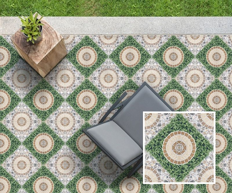 Họa tiết cỏ xanh kết hợp cùng những viên sỏi nhiều màu sắc như: trắng, xám, đen… được rải một cách tự nhiên. Mẫu gạch lát nền giả cỏ xen sỏi mang đến vẻ đẹp độc đáo, tạo cảm giác như một lối đi trong khu vườn thiên nhiên thực thụ. Đây là lựa chọn yêu thích cho các lối vào nhà hoặc khoảng sân trước, mang lại năng lượng tích cực và sự tươi mới.