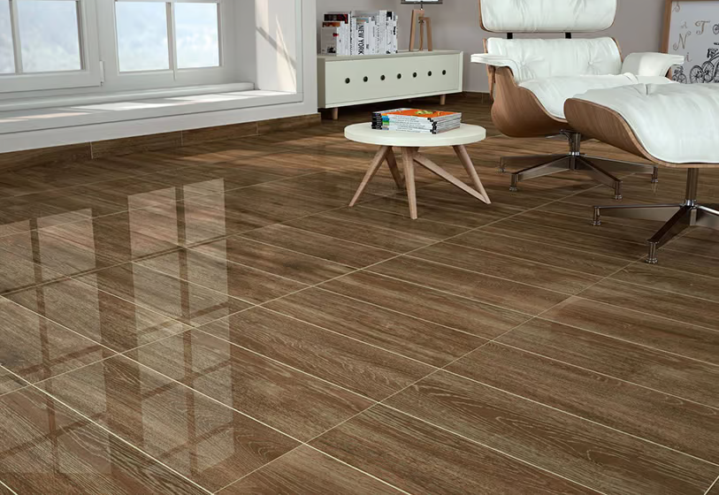 Đặc biệt, bề mặt bóng sáng của mẫu gạch giả gỗ lát nền màu nâu bóng này sẽ càng phù hợp hơn với nơi có mật độ lưu thông cao như khu vực phòng khách. Chúng giúp bạn dễ dàng vệ sinh, lau chùi các vết bẩn.