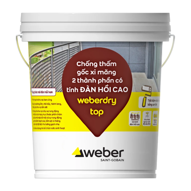 Weberdry top là vữa chống thấm 2 thành phần có tính đàn hồi cao, giúp chịu được các vết nứt nhỏ và sự co giãn của bề mặt ban công do nhiệt độ môi trường thay đổi liên tục. Điều này ngăn chặn tình trạng nước thấm xuống sàn dưới, bảo vệ cấu trúc công trình.