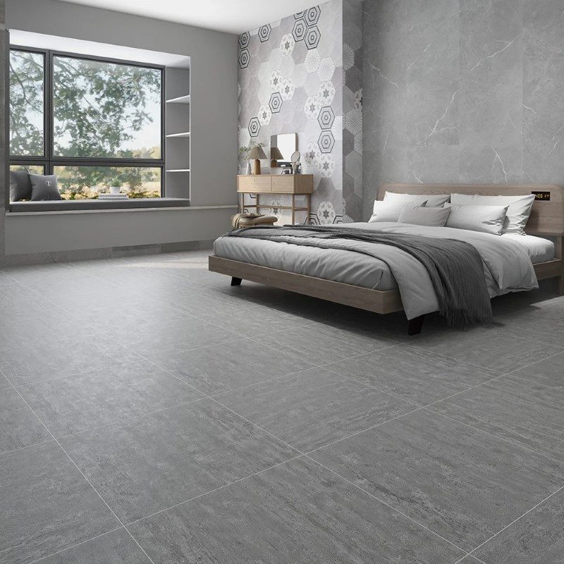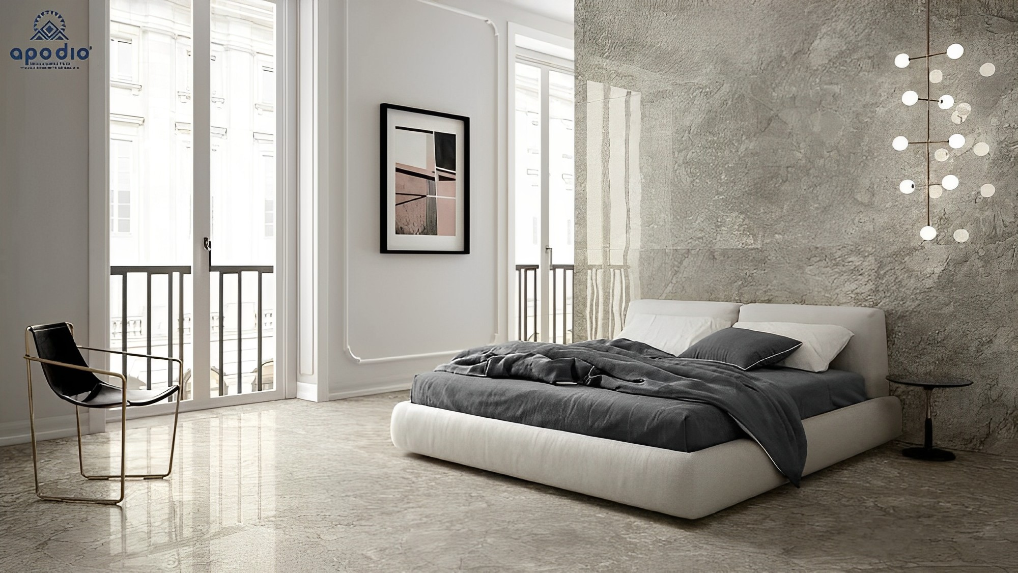 Gạch lát nền 80x80 trong phòng ngủ mang đến sự yên tĩnh và thoải mái, đặc biệt là với các gam màu nhẹ như be, kem hoặc ghi sáng. Kích thước gạch lớn tạo cảm giác bề mặt sàn phẳng, gọn gàng, giúp căn phòng trở nên thư giãn hơn. Bề mặt nhám nhẹ hay mờ còn giúp giảm trơn trượt và tăng cảm giác êm ái khi bước chân trần trên sàn.