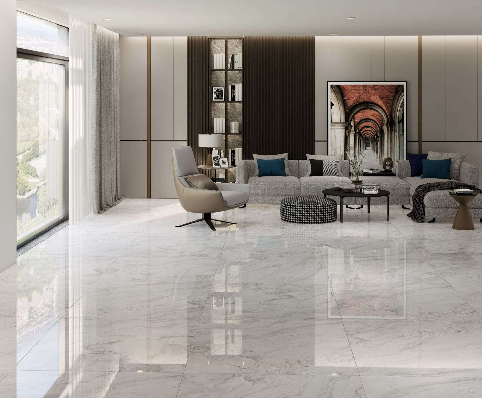 Gạch lát nền trắng: Màu trắng luôn là lựa chọn hàng đầu vì nó toát lên vẻ tinh tế, thanh lịch và sạch sẽ. Hơn nữa, trắng còn có công dụng đặc biệt là khả năng khuếch đại ánh sáng tự nhiên và ngay lập tức giúp phòng khách có cảm giác rộng rãi, thoáng đãng hơn hẳn.