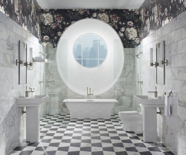Nếu bạn đang thiết kế phòng tắm theo phong cách đơn sắc, vậy thì tại sao không sử dụng gạch lát nền nhà tắm đen và trắng để tạo thành hình bàn cờ thú vị. Còn nếu bạn muốn sáng tạo hơn nữa thì gạch lát nhà vệ sinh cao cấp gạch mosaic hoặc gạch giả gỗ là một gợi ý.