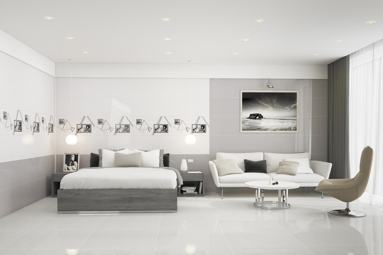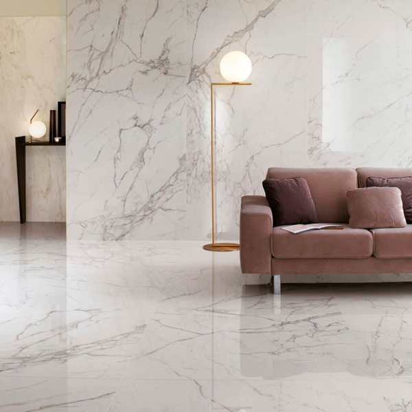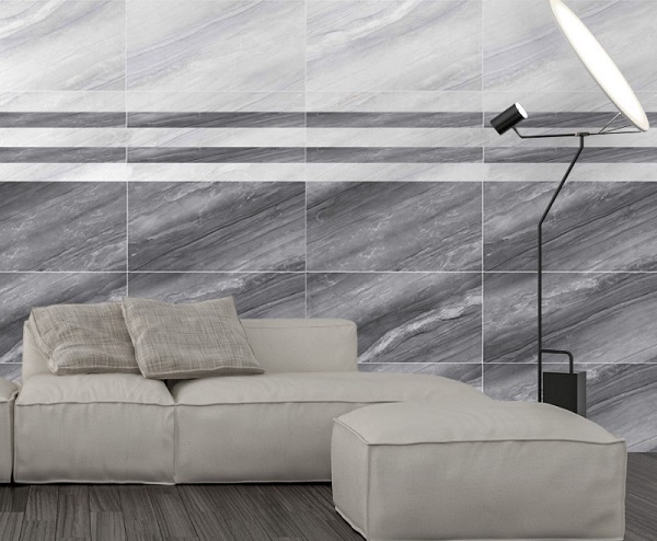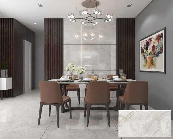 Với phòng khách, các mẫu gạch vân đá gam màu trung tính, bề mặt bóng mờ sẽ giúp không gian thêm sang trọng và hiện đại.