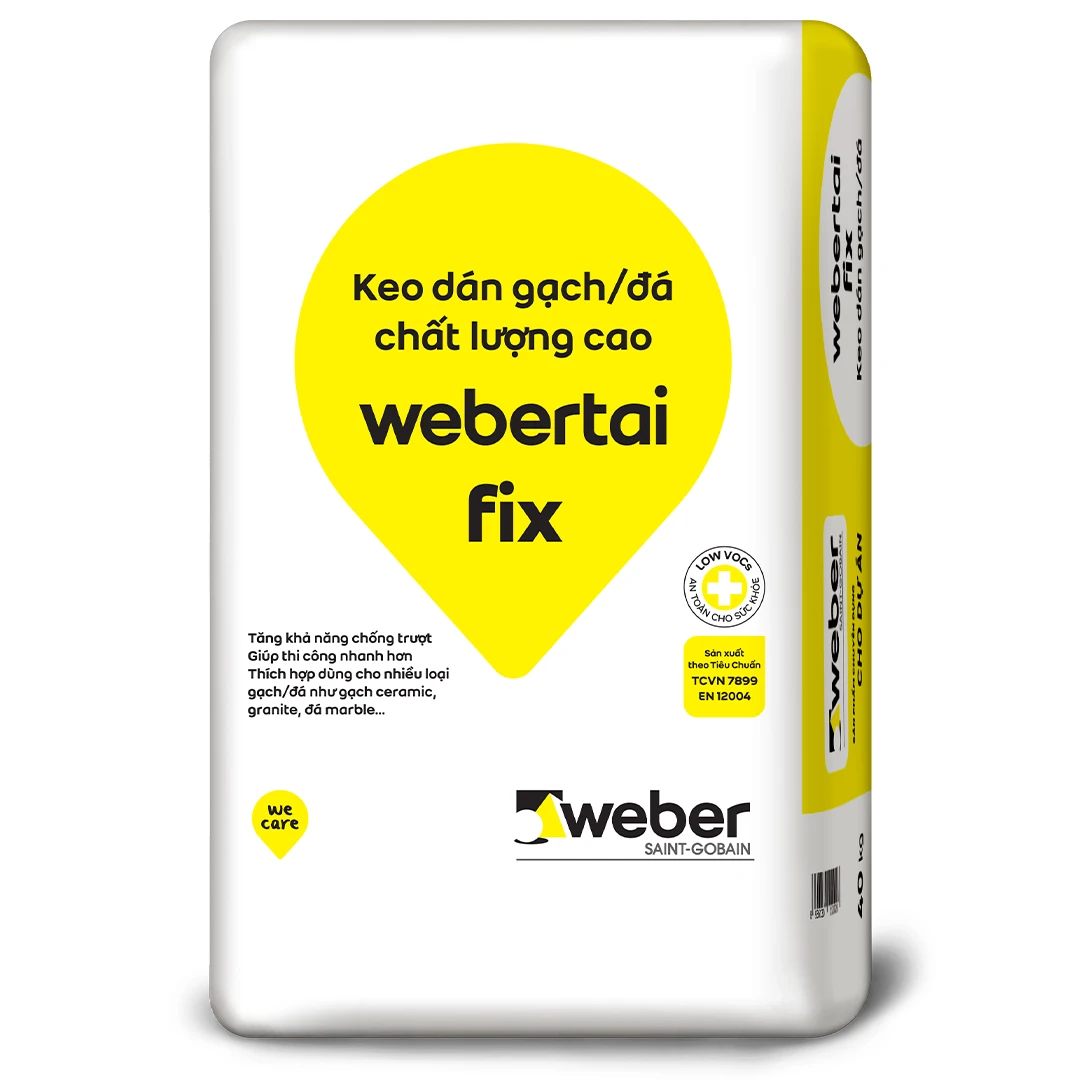 Webertai fix là dòng keo dán gạch với độ bám dính gấp 4 lần, phù hợp cho hầu hết các loại gạch/đá phổ biến như ceramic, granite, porcelain, marble… với những đặc điểm nổi bật như: