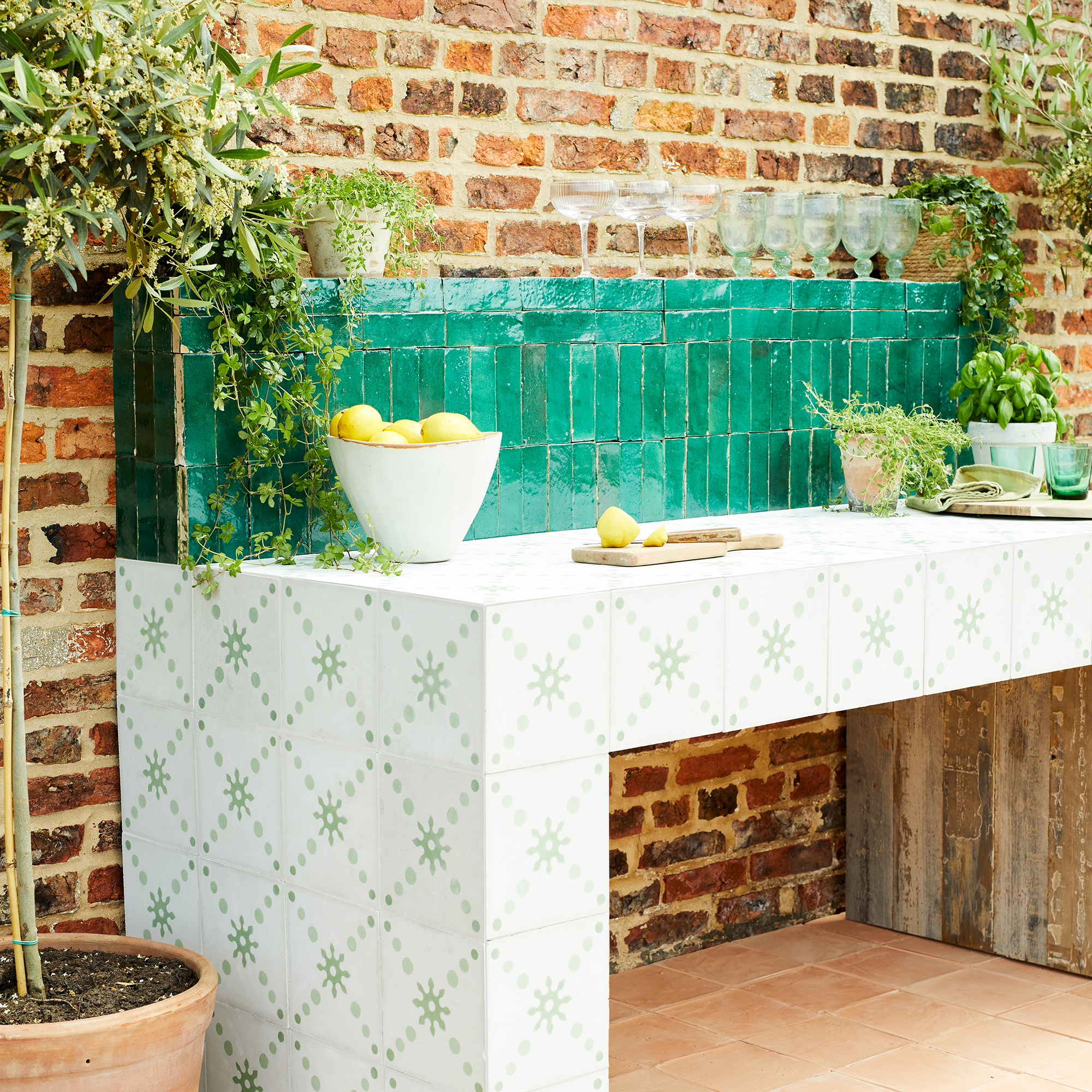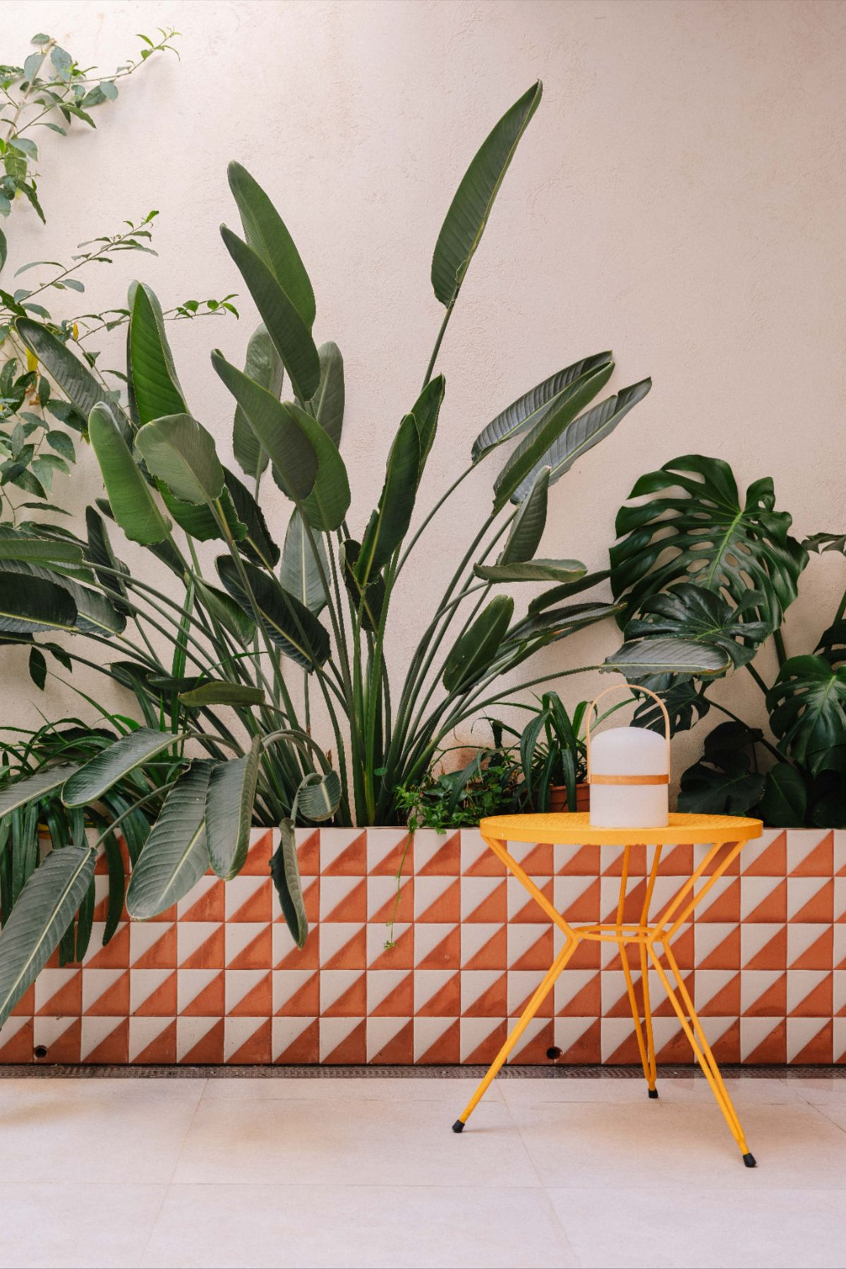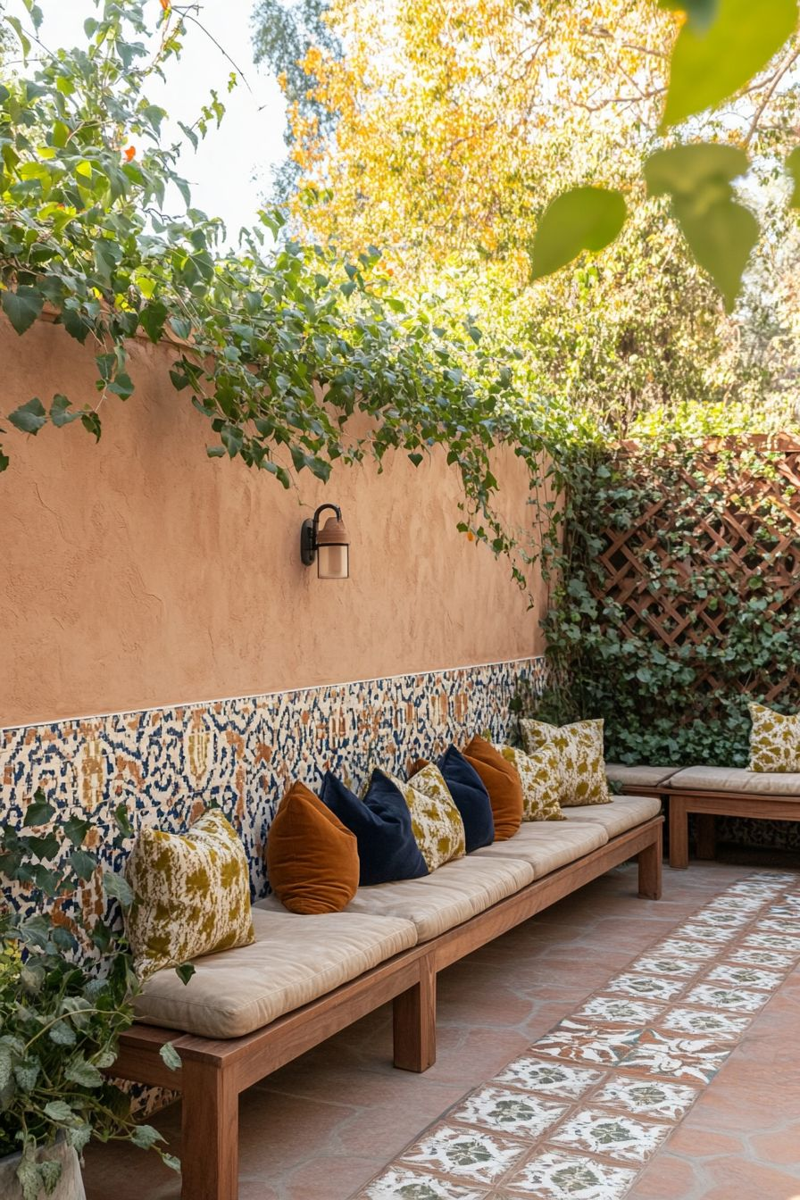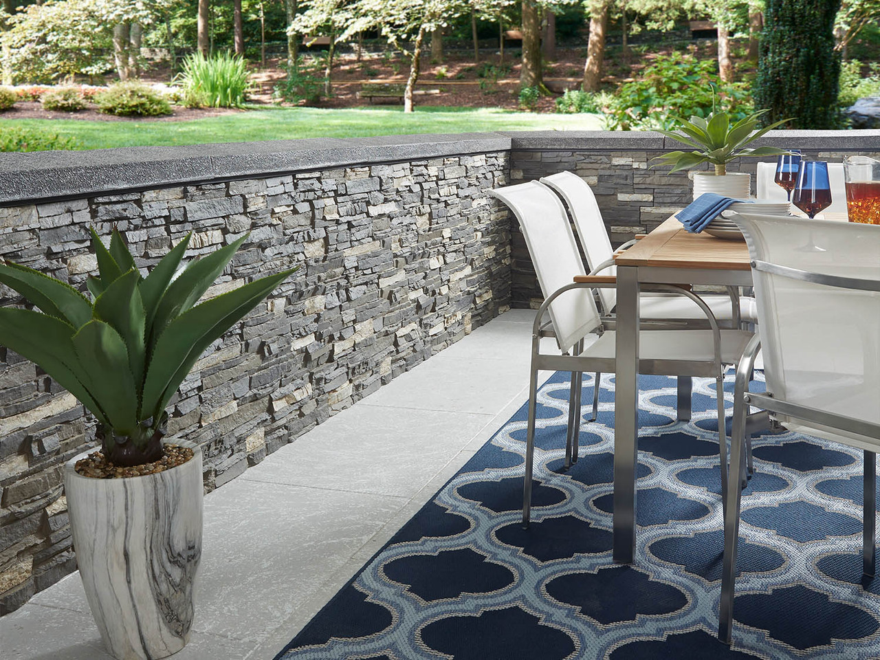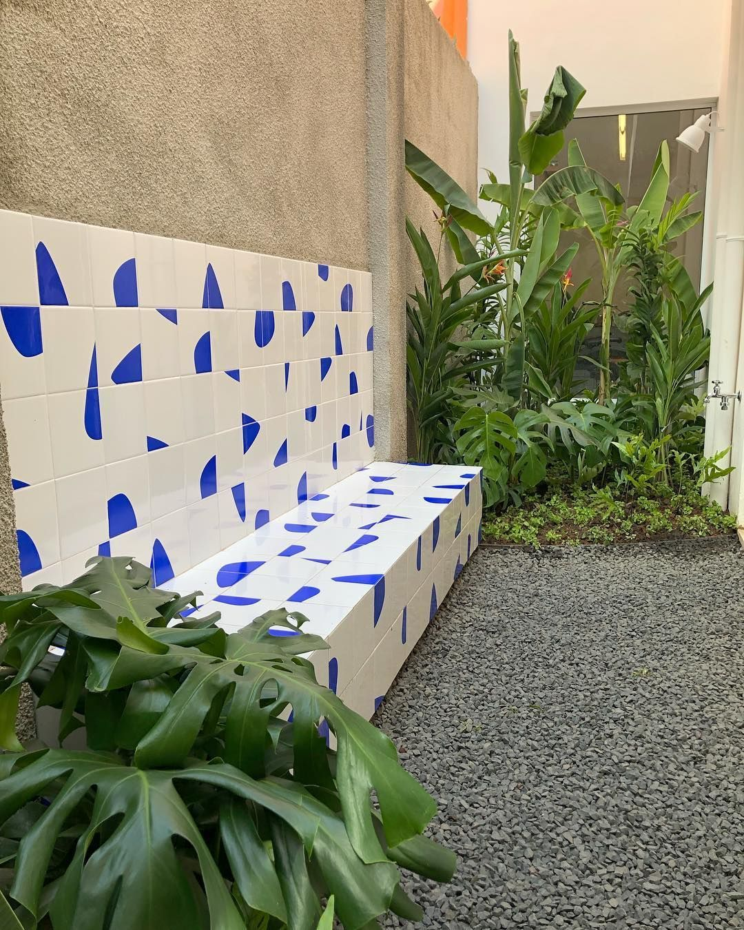 Gạch ốp chân tường khu vực sân vườn thường dùng gạch men nhám, gạch thẻ chống trơn hoặc gạch giả đá, giúp chống thấm, chịu lực và hạn chế trơn trượt, đồng thời mang lại tính thẩm mỹ hài hòa với không gian sân vườn.