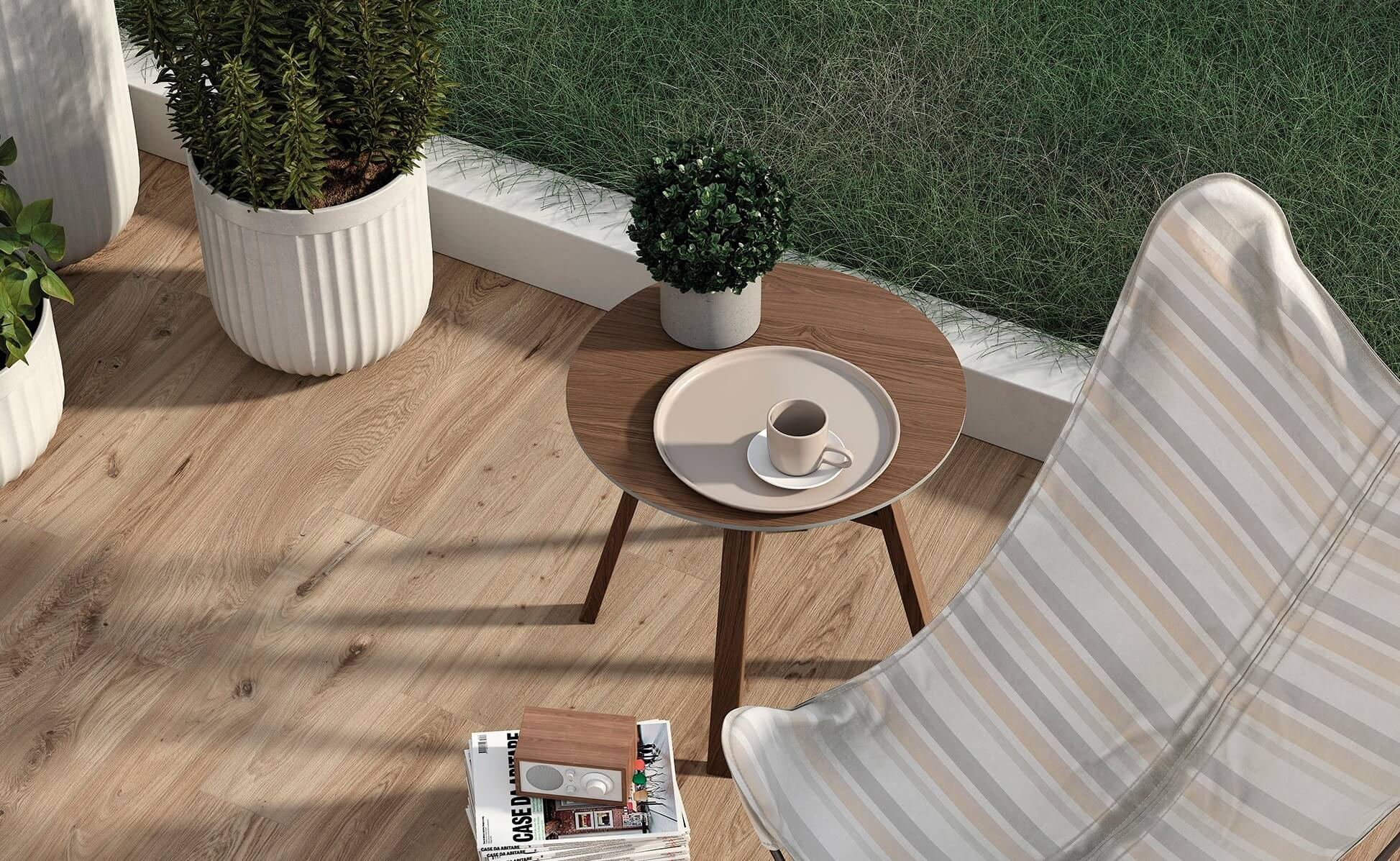 Gạch giả gỗ ốp tường ngoài trời là loại gạch được thiết kế mô phỏng vân gỗ tự nhiên, dùng để ốp mặt tiền, cổng, ban công hay sân vườn. Loại gạch này chống thấm, chịu được nắng mưa và thời tiết khắc nghiệt, đồng thời mang đến vẻ ấm áp, sang trọng và gần gũi với thiên nhiên mà không cần bảo dưỡng phức tạp như gỗ thật.