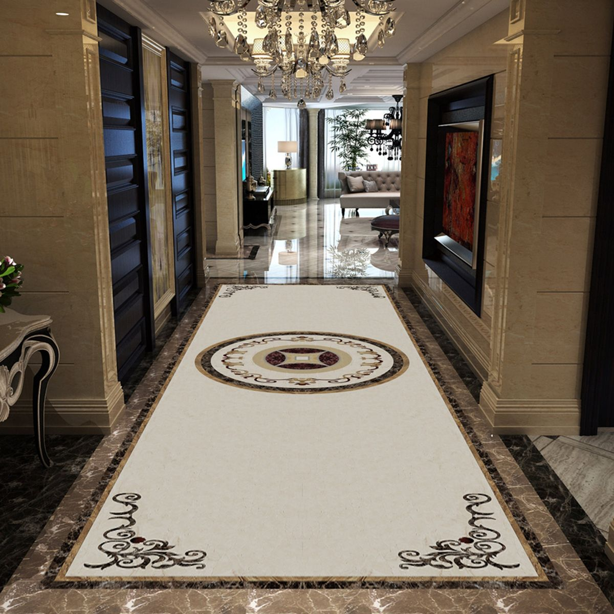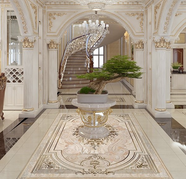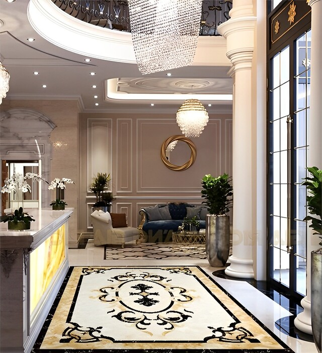 Khu vực tiền sảnh chính là nơi lý tưởng để sử dụng gạch thảm lát sàn bởi khả năng tạo điểm nhấn ấn tượng và thể hiện phong cách thẩm mỹ tinh tế. Do đặc thù là không gian thường xuyên đón tiếp và di chuyển nhiều người, việc lựa chọn mẫu gạch thảm đẹp cần được chú trọng đến họa tiết, màu sắc và kích thước sao cho hài hòa với tổng thể kiến trúc.