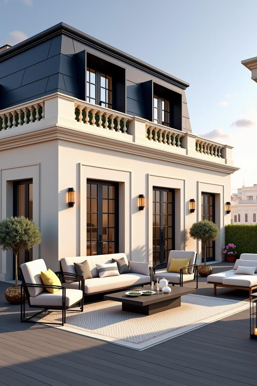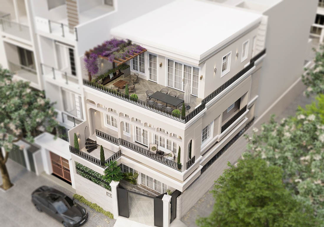 Mẫu nhà phố tân cổ điển có sân thượng mang đến không gian sống tiện nghi và thoáng đãng. Sân thượng được thiết kế hài hòa với tổng thể kiến trúc, có thể bố trí tiểu cảnh, khu trà hoặc vườn xanh thư giãn. Sự kết hợp giữa vẻ đẹp tinh tế của phong cách tân cổ điển và không gian mở hiện đại giúp ngôi nhà vừa sang trọng, vừa gần gũi với thiên nhiên.