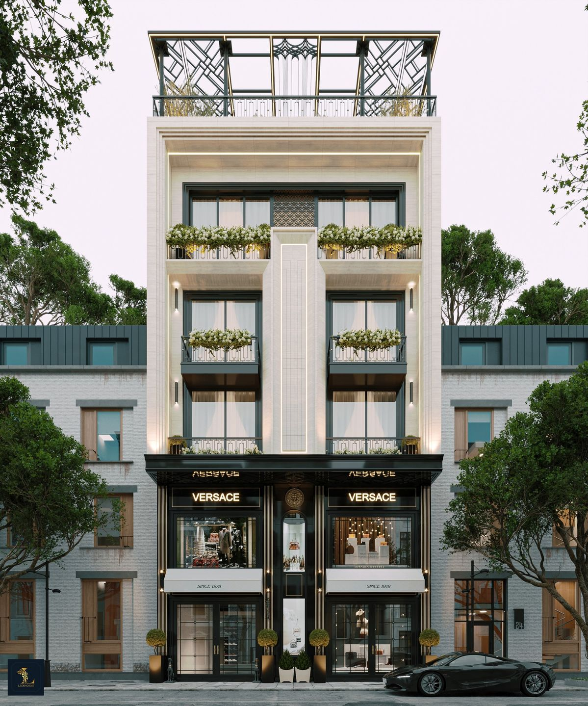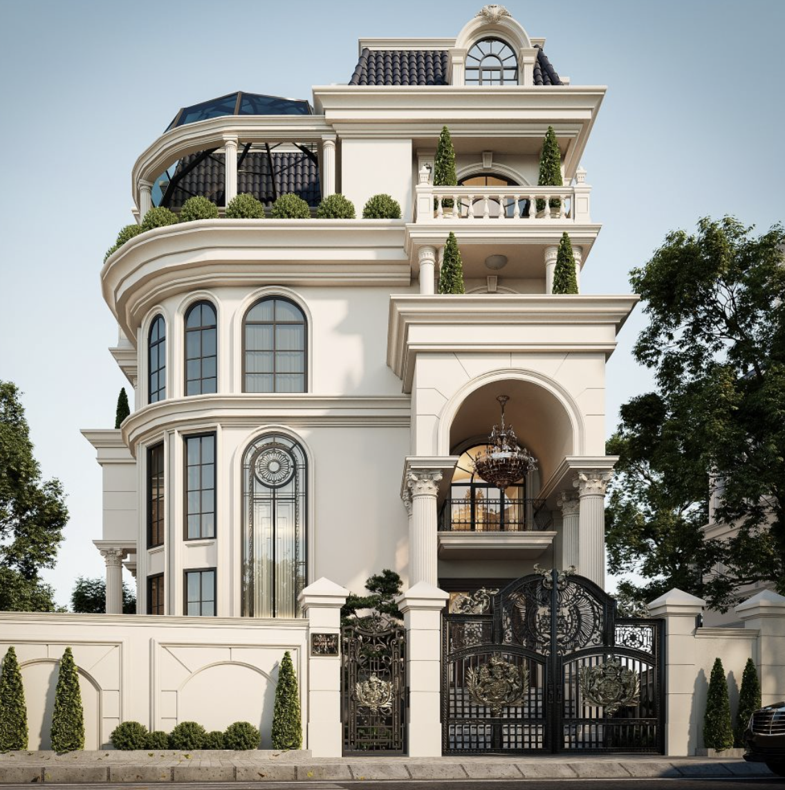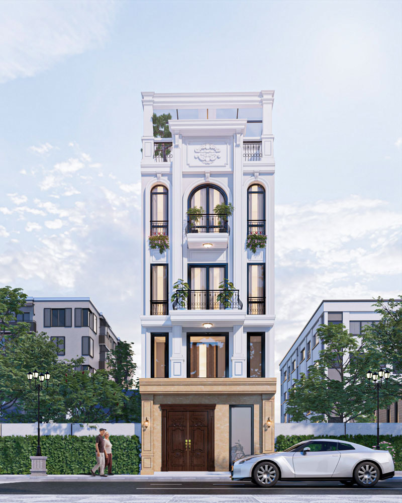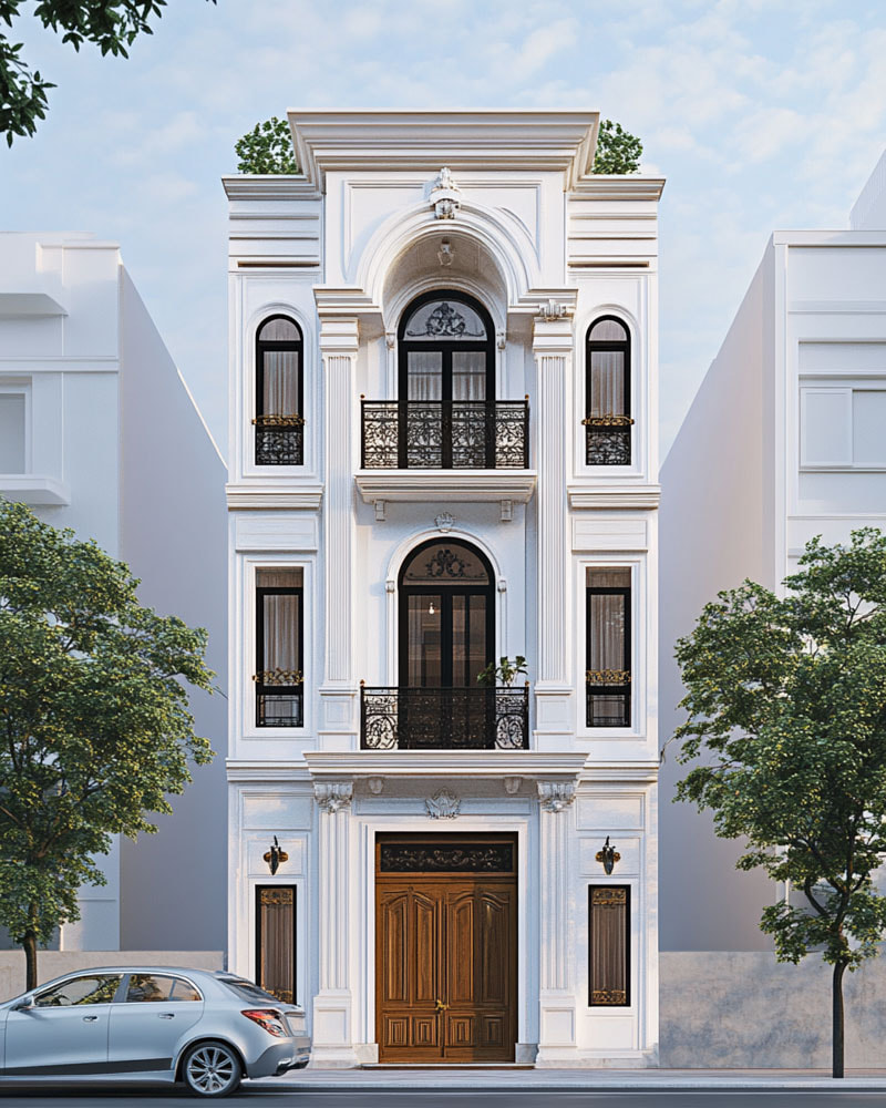 Mẫu nhà phố tân cổ điển 4 tầng toát lên vẻ sang trọng và đẳng cấp với kiến trúc đối xứng, phào chỉ tinh xảo và hệ cột vững chắc. Thiết kế nhiều tầng giúp tối đa hóa công năng, phù hợp với gia đình đông thành viên hoặc kết hợp kinh doanh, đồng thời vẫn giữ được nét thanh lịch, hài hòa đặc trưng của phong cách tân cổ điển.