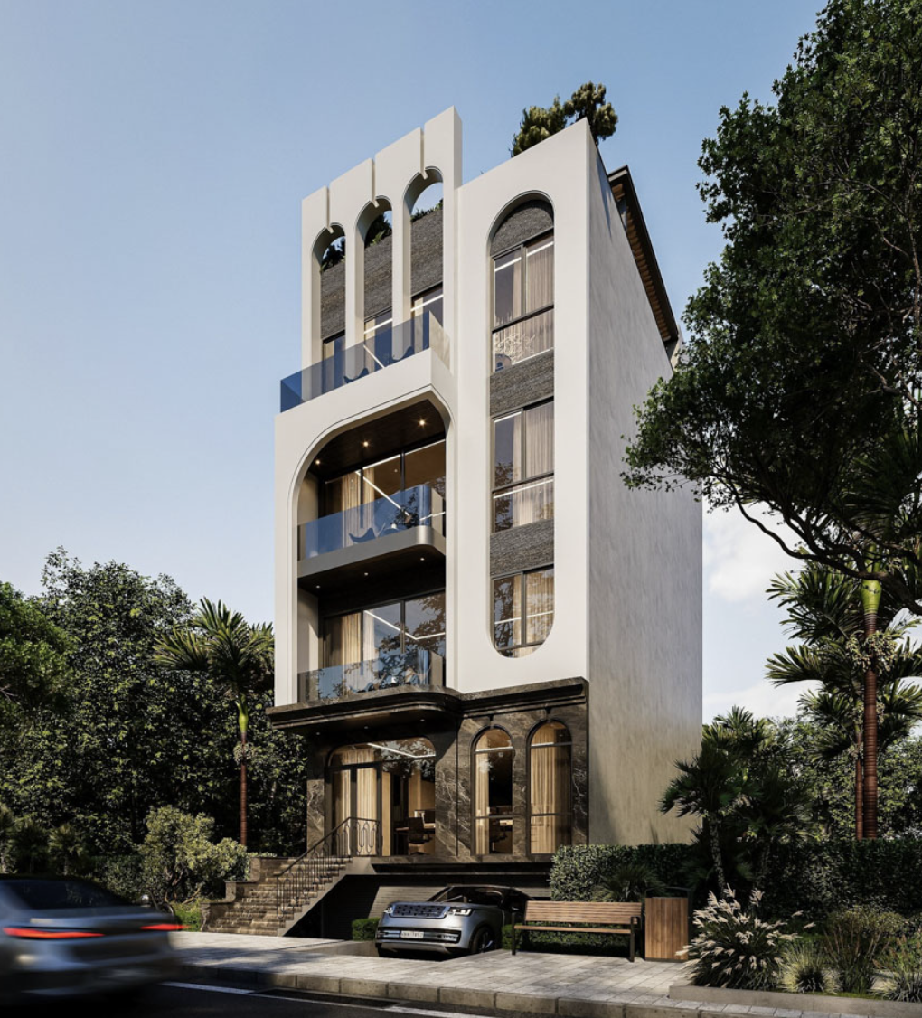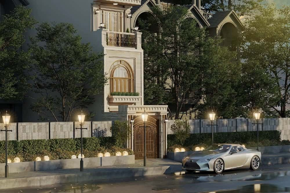 Kiến trúc độc đáo của nhà phố tân cổ điển thể hiện ở sự cân đối, hài hòa giữa hình khối và chi tiết trang trí. Mặt tiền thường được thiết kế đối xứng với hệ cột, ban công, mái vòm hoặc cửa sổ uốn cong nhẹ, tạo nên vẻ đẹp bề thế và tinh tế. Sự kết hợp giữa đường nét cổ điển và bố cục hiện đại giúp công trình vừa sang trọng, vừa phù hợp với không gian đô thị hiện nay.