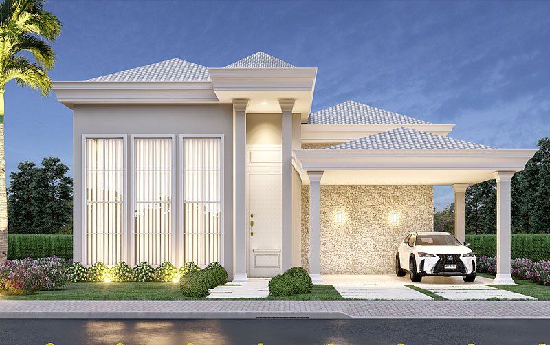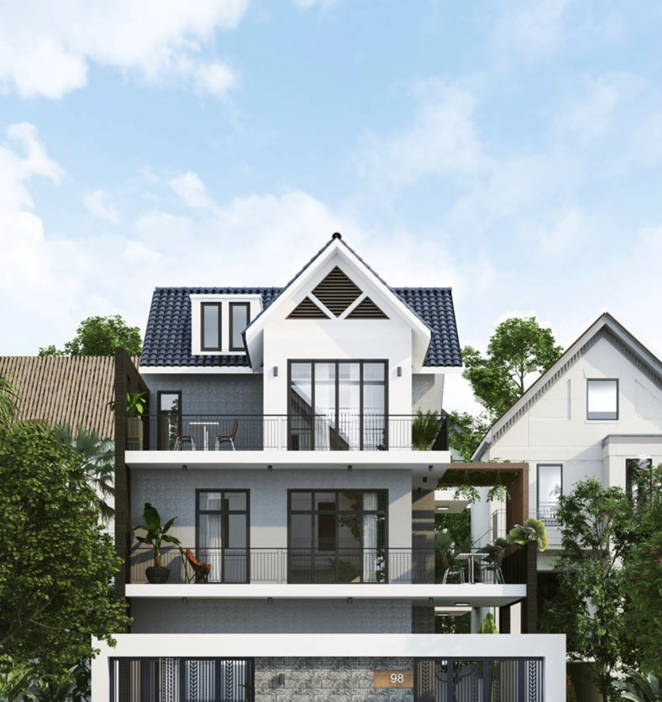 Mẫu nhà phố tân cổ điển mái Thái nổi bật với vẻ đẹp thanh thoát, sang trọng và gần gũi. Phần mái Thái dốc nhẹ giúp thoát nước tốt, chống nóng hiệu quả, đồng thời tạo điểm nhấn cho tổng thể kiến trúc. Sự kết hợp giữa đường nét tân cổ điển tinh tế và mái Thái truyền thống mang đến không gian sống vừa hiện đại, vừa bền vững theo thời gian.