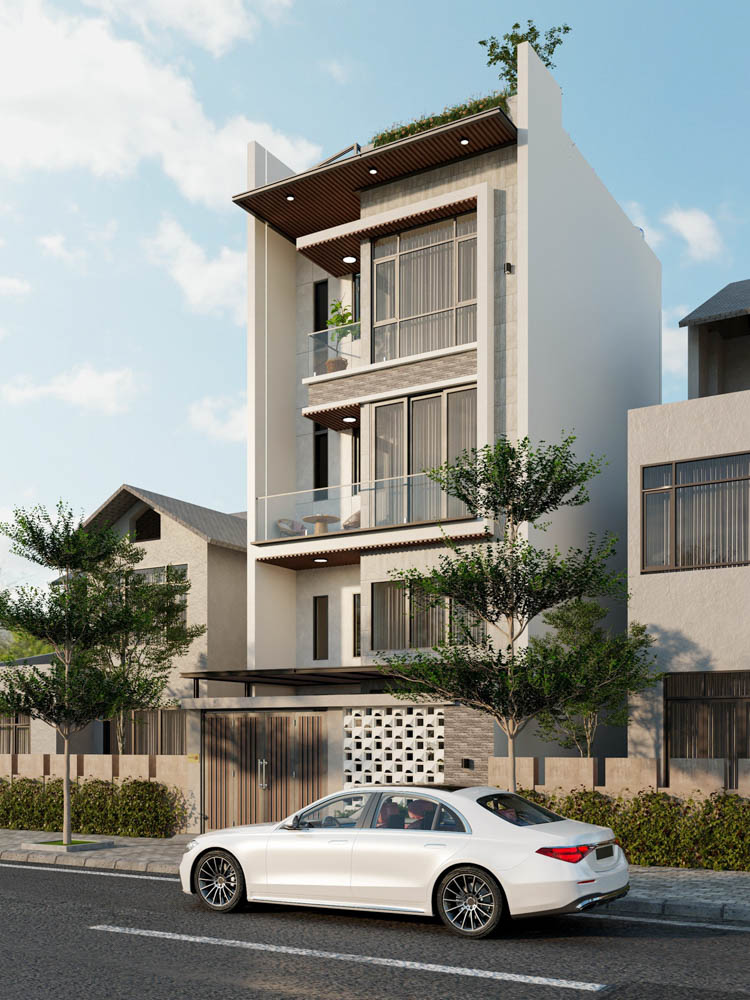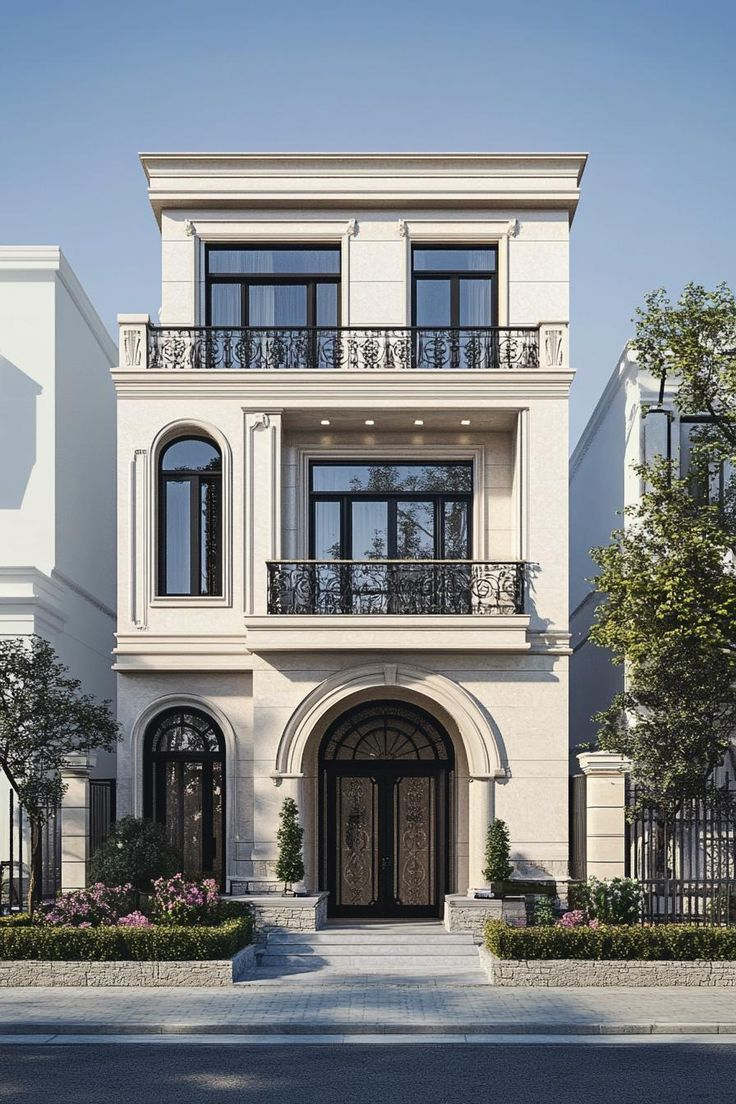 Mẫu nhà phố tân cổ điển mặt tiền gây ấn tượng mạnh bởi sự cân đối trong bố cục, đường nét hoa văn tinh tế và các chi tiết trang trí sang trọng. Mặt tiền thường sử dụng gam màu trắng, kem hoặc vàng nhạt, kết hợp cùng cửa gỗ, lan can sắt nghệ thuật và hệ cột đối xứng tạo cảm giác bề thế. Đây là điểm nhấn quan trọng giúp ngôi nhà toát lên vẻ đẳng cấp ngay từ cái nhìn đầu tiên.