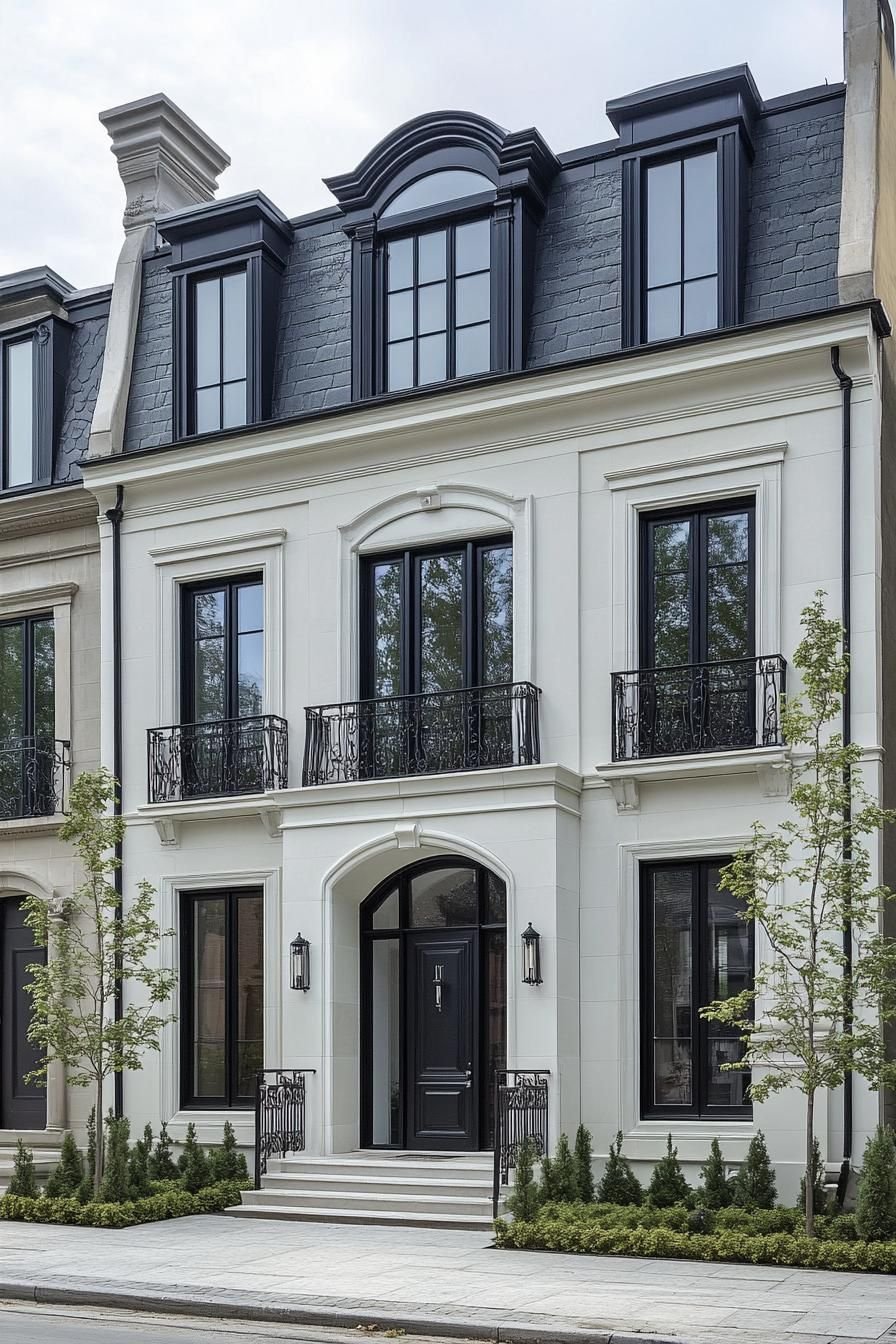 Mẫu nhà phố tân cổ điển mái Mansard thể hiện đậm nét phong cách châu Âu quý phái với phần mái cao, vuông vức và sang trọng. Kiểu mái này không chỉ tạo ấn tượng thẩm mỹ mạnh mẽ mà còn giúp tận dụng không gian áp mái làm phòng ngủ hoặc kho. Sự kết hợp giữa kiến trúc tân cổ điển tinh tế và mái Mansard bề thế mang đến tổng thể cân đối, đẳng cấp và trường tồn với thời gian.