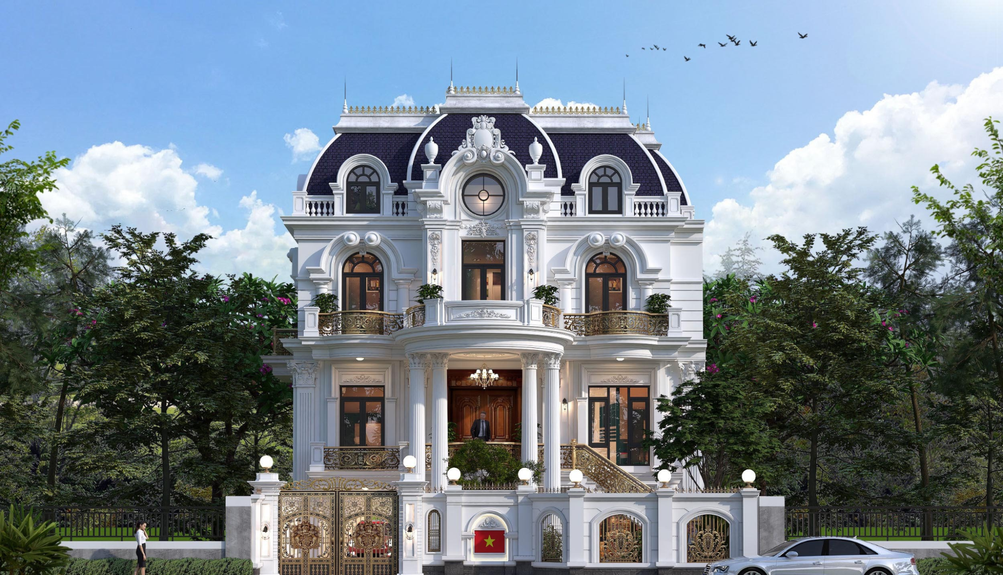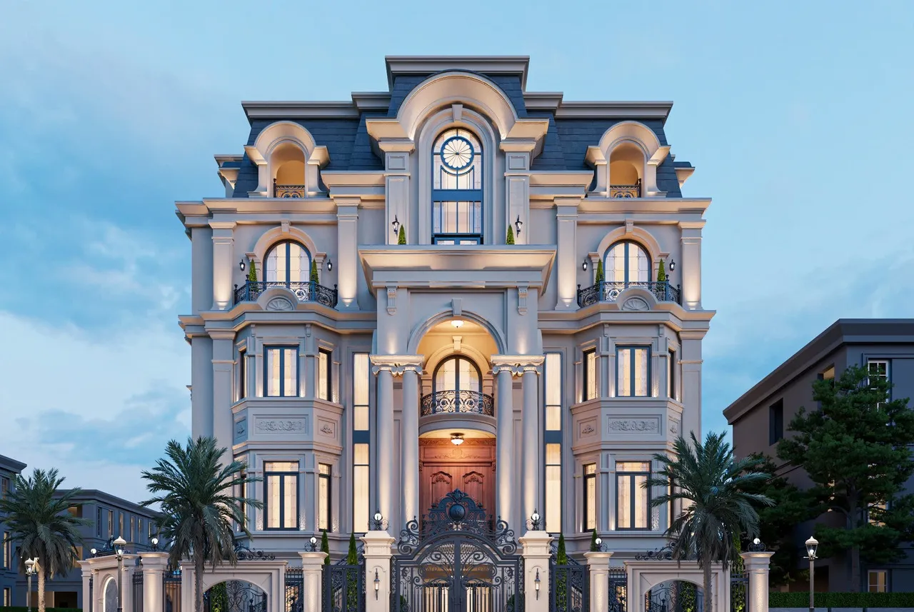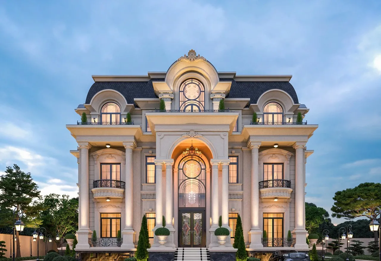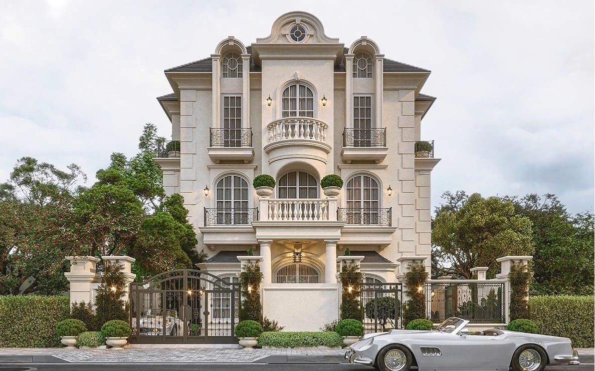 Phong cách cổ điển lấy cảm hứng từ kiến trúc châu Âu, nổi bật với sự đối xứng và những chi tiết được chăm chút kỹ lưỡng. Cột trụ lớn, mái vòm cong cùng các chi tiết tinh xảo tạo nên vẻ bề thế và chuẩn mực. Màu sắc chủ đạo thường là trắng, kem hoặc vàng nhạt giúp công trình toát lên vẻ trang nhã và sang trọng vượt thời gian.