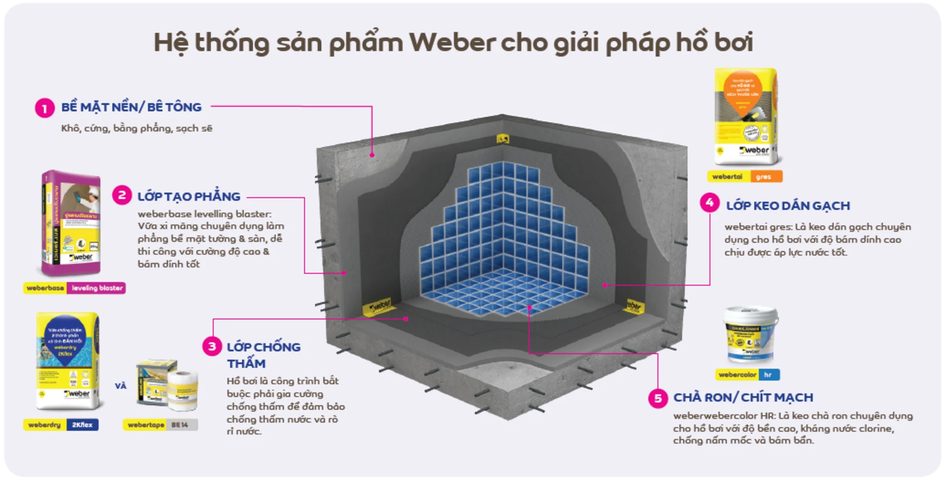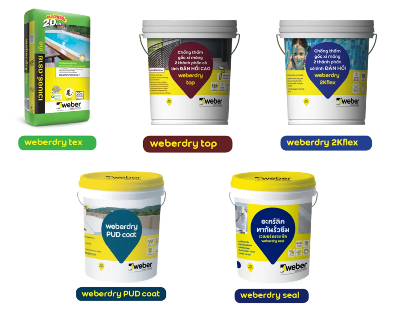 Riêng ở Việt Nam, Weber đc biết đến là thương hiệu hàng đầu về Keo dán gạch, Keo chà ron, được sử dụng rộng rãi cho các dự án lớn như Khu đô thị Đại Quang Minh, Vinhomes Tân Cảng, Cocobay Đà Nẵng, JW Mariott Phú Quốc,…. Ngoài Keo dán gạch, Keo chà ron, Weber còn cung cấp các dòng sản phẩm chống thấm đáp ứng đầy đủ các khu vực như nhà bếp, ban công, sân thượng, sàn mái,… và đặc biệt là hồ bơi. Sản phẩm chống thấm Weber được sử dụng rộng rãi trên toàn thế giới, đặc biệt trong khu vực lân cận như Indonesia, Thái Lan, Ấn Độ (Dòng sản phẩm chống thấm Weber đã vinh dự lọt vào Top 3 sản phẩm chống thấm được tin dùng năm 2018 bởi Những Kiến trúc sư hàng đầu Ấn Độ).